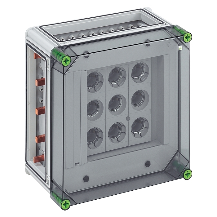 DIAZED® skříň pro jezdcové pojistky, 3 x 3 póly DIII patice jezdcové pojistky, E 33 závit, Jmenovitý proud 63 A, Šroubovací přípojka 1,5 - 25 mm2, na sběrnici, 5 pólů, s 5 přípojnicovými svorkami 4 - 35 mm2, N svorky 1,5 - 16 mm2, PE svorky 1,5 - 16 mm2, 3 x spojovací prvek (GGV), na systém přípojnic 400 A, s transparentním víkemRozměry: 320 x 320 x 179 mm