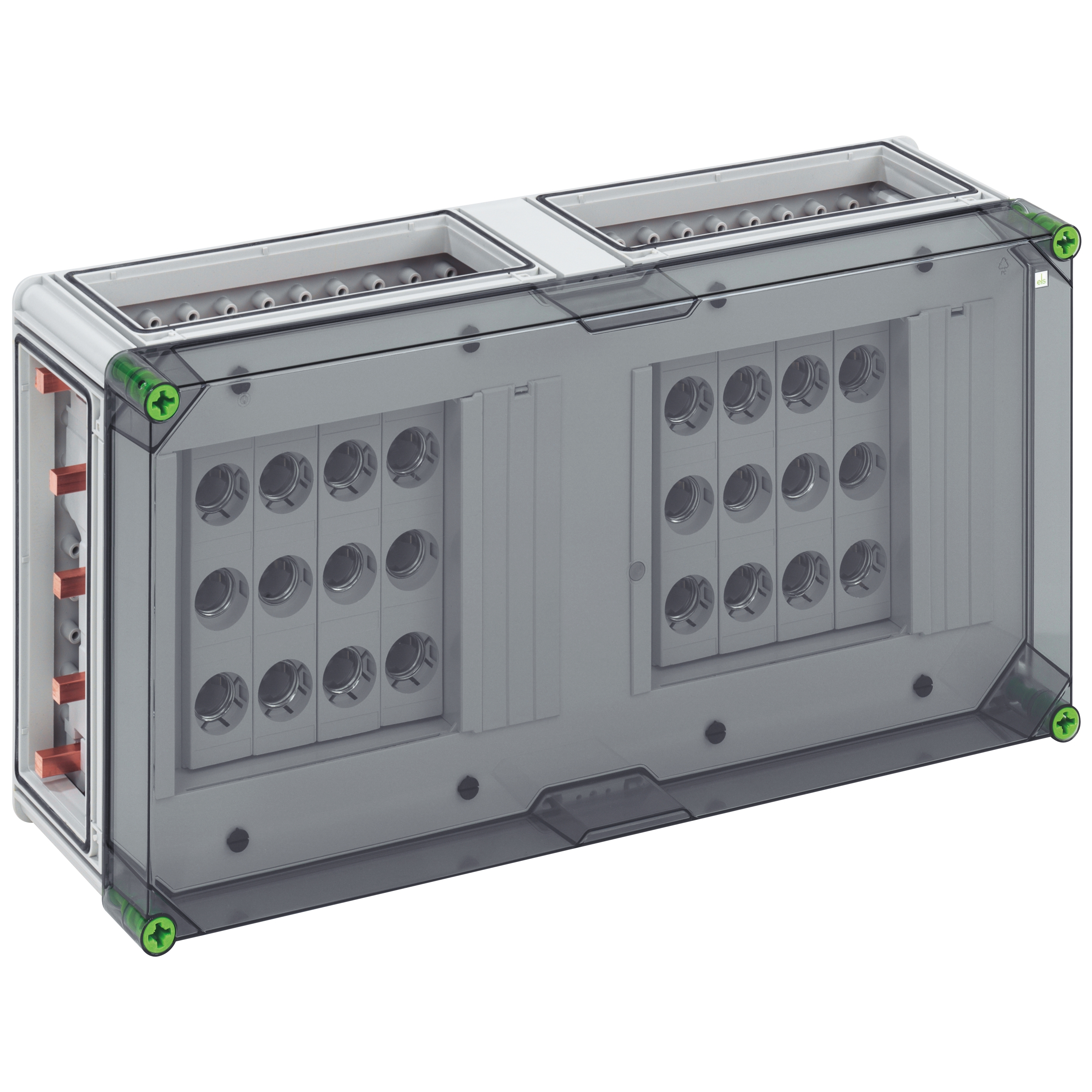 DIAZED® skříň pro jezdcové pojistky, 8 x 3 póly DII patice jezdcové pojistky, E 27 závit, Jmenovitý proud 25 A, Šroubovací přípojka 1,5 - 25 mm2, na sběrnici, 5 pólů, N svorky 1,5 - 16 mm2, PE svorky 1,5 - 16 mm2, 4 x spojovací prvek (GGV), na systém přípojnic 250 A, s transparentním víkemRozměry: 640 x 320 x 179 mm