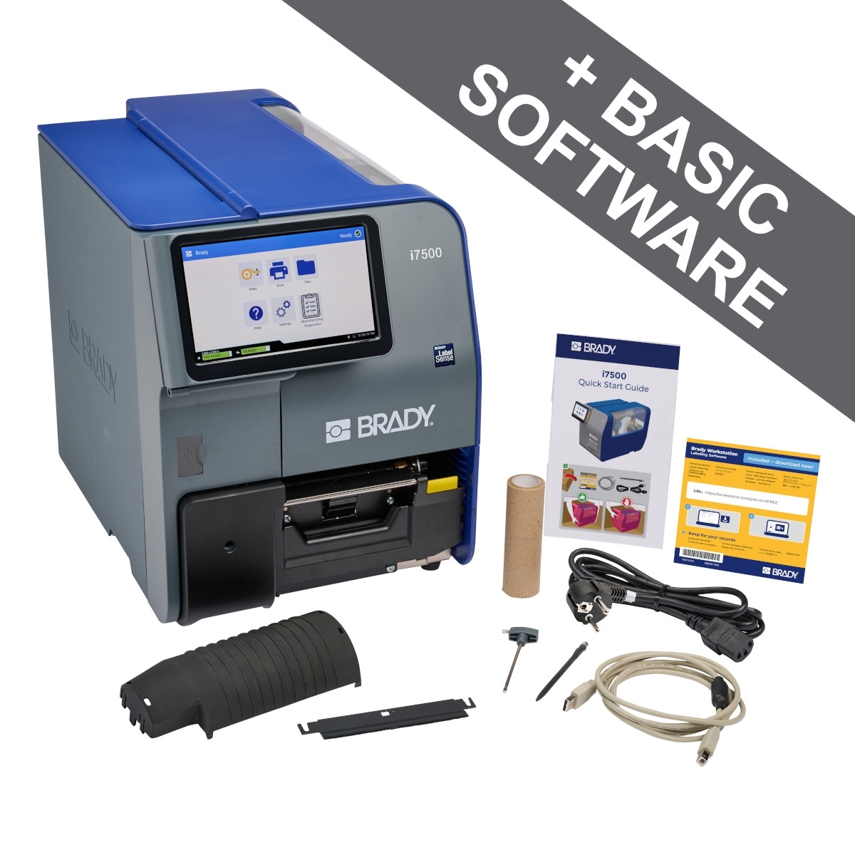 This i7500 Printer Peel configuration 600dpi comes in a cardboard box. It ships with a Smooth-edge peel bar plate (installed), an Internal rewind componentry (installed), an Internal rewind Guide plate, a T-20 wrench, a 1.5" internal rewind takeup core, a Power cord (EU plug), a USB cable, A Brady WorkStation Basic Software and a QuickStart Guide.