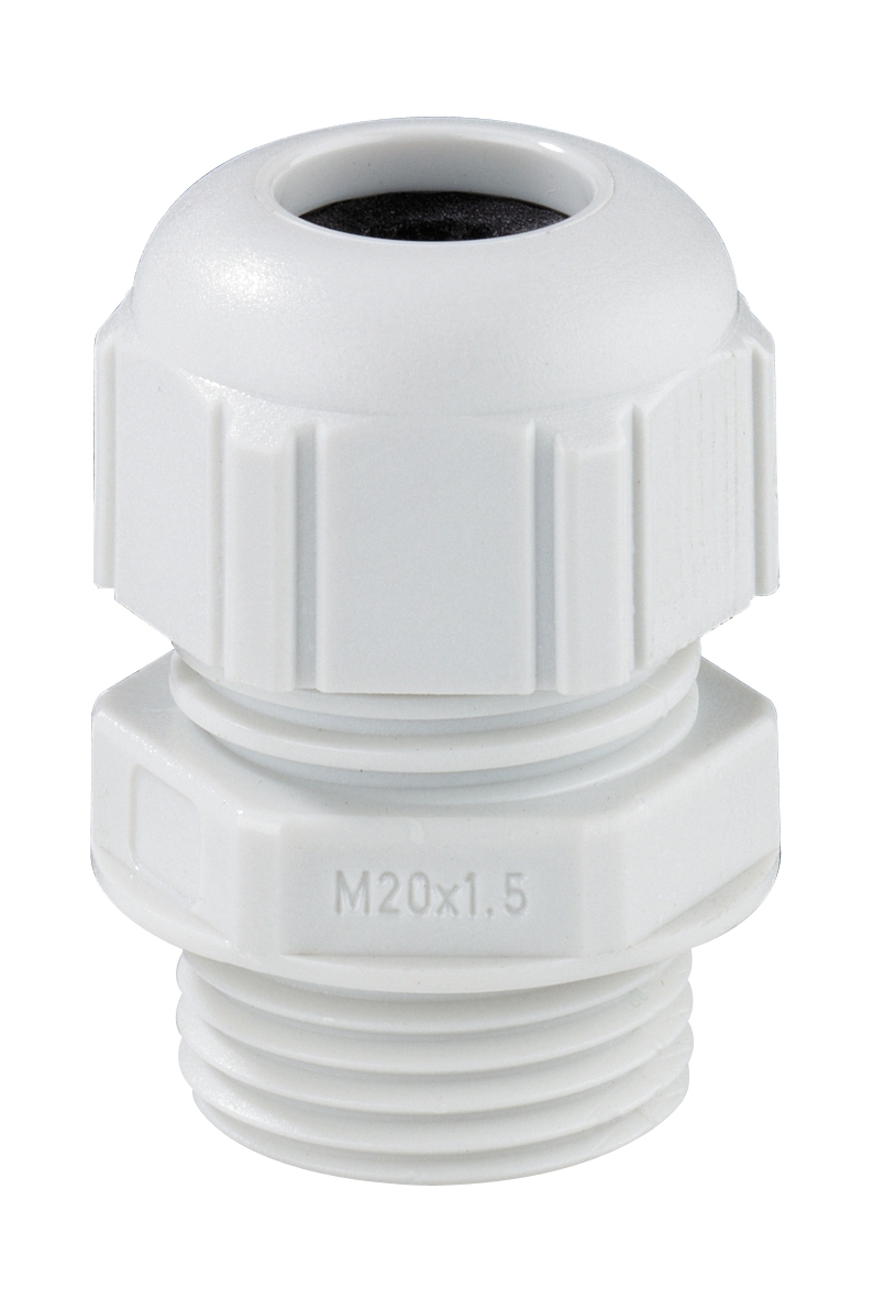 Kabelová vývodka, IP68/IP69*, s odlehčením tahu, dlouhý závit, M_ x 1,5 mm2 bez kontramatice, polyamid, šedé(* IP69 ve spojení s prázdnými skříněmi a skříňovými rozvaděči řady GEOS a spojovacími krabicemi řady Abox Pro), Rozsah těsnění 2 - 6,5 mm2 Délka závitu 12 mm2ozměry: 16,75 x 16,75 x 32 mm