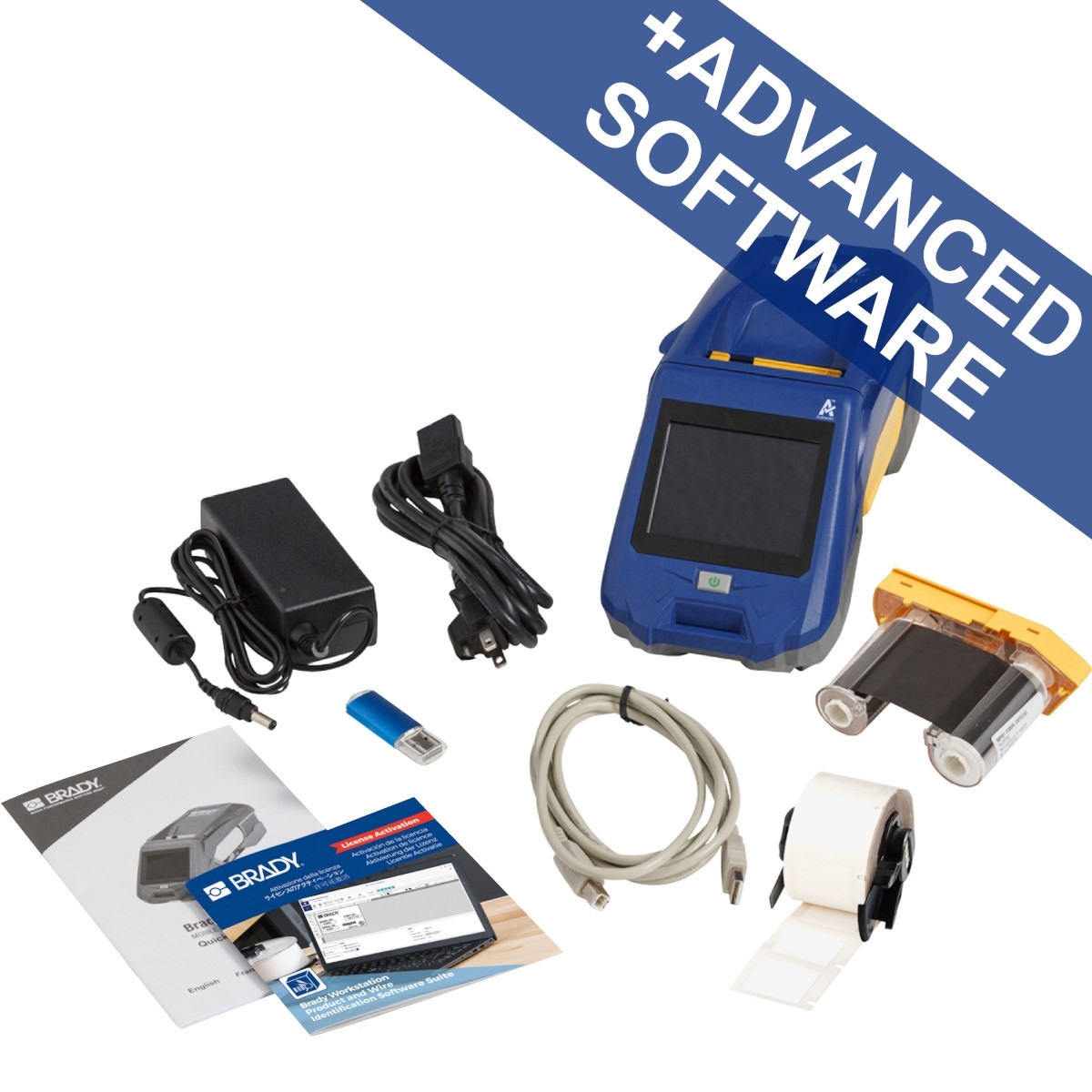 This printer ships in a cardboard box holding a USB cable, a quick start guide, an AC powercord, a USB stick holding product info and Windows driver, a licence for Brady Workstation Software suites, a roll of M6-11-427 and an M61-R4310 ribbon.