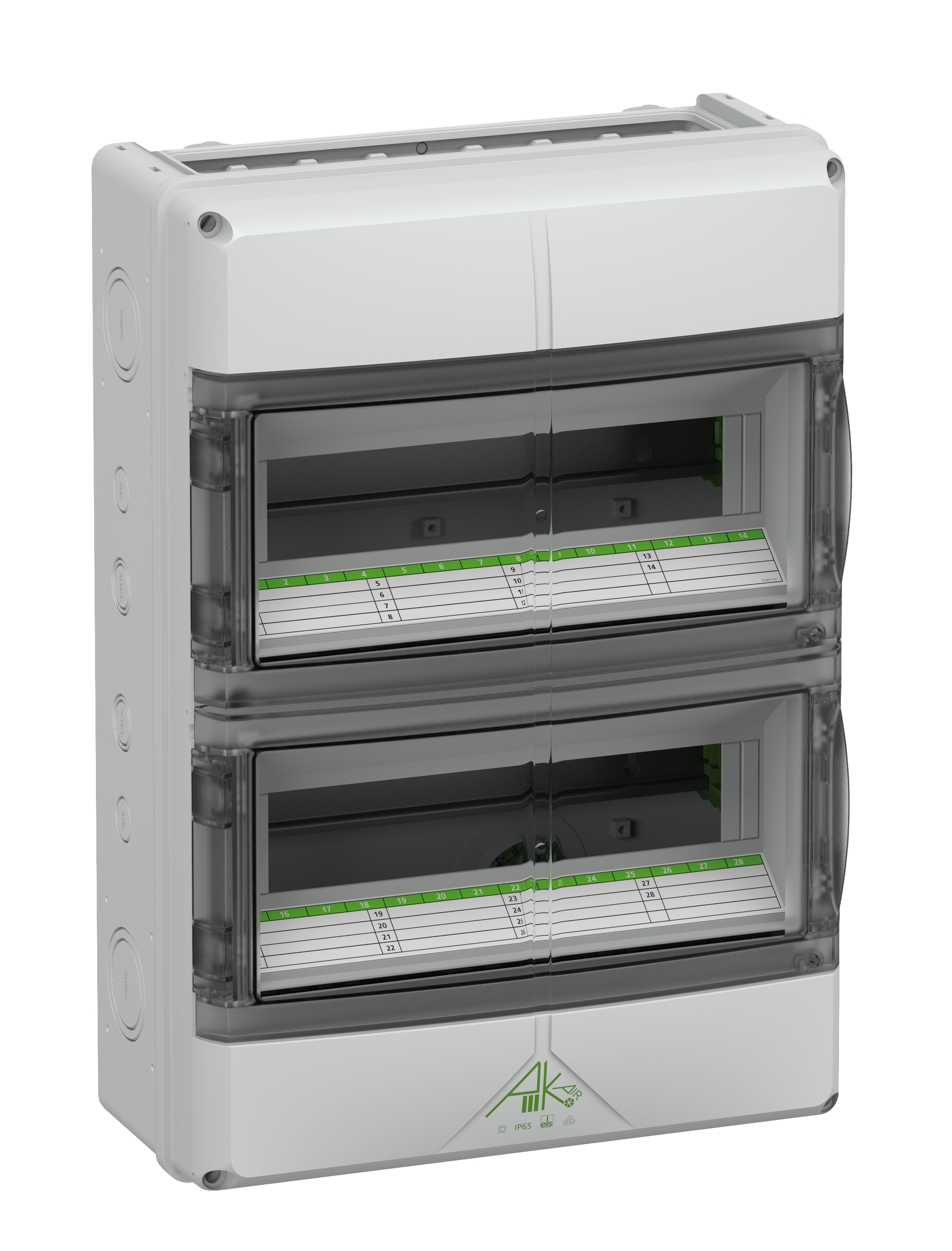 Malý rozvaděč, se stupněm krytí IP65, 2 Řady, 28 modulů, Typ příruby, s integrovanými ventilačními prvky pro zmírnění vytváření kondenzační vody, Domezovací provozní napětí: 400V AC, Domezovací izolační napětí: 1000V AC, 1500V DC, Certifikováno VDE (DIN EN 60670-1/-24 (VDE 0606-1/-24)), UL-EU (EN 62208), UL-EU (EN 61439-1/-2), UL-EU (EN 61439-1/-3), UL-EU (EN 61439-1 & EN IEC 61439-7), DLG (odolnost vůči čpavku), nahoře a dole otevřené bočnice pro montáž různých přírub nebo pro spojování různých AK-F skříní pomocí spojovací příruby, pro standardní instalace ve vnitřním prostoru a chráněném venkovním prostředí, Svorky PE/N, skládající se z: PE svorkovnice se 6 šroubovými svorkami 2,5-16mm2 a 21 svorkami push-in 0,75-4mm2, 3 N svorkovnice (spojeny propojkou) každá se 2 šroubovými svorkami 2,5-16mm2 a 6 svorkami push-in 0,75-4mm2 s ovládací páčkou k povolování vodičů bez nástrojeRozměry: 315 x 450 x 155 mm2řiložené příslušenství: Dvojitá membránová vývodka: 1x M16, 5x M20, 2x M25, 1x M32, 1x M40, Zaslepovací zátky, Krycí a popisovací pásky