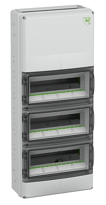 Malý rozvaděč, se stupněm krytí IP65, 3 Řady, 42 modulů, Typ příruby, s integrovanými ventilačními prvky pro zmírnění vytváření kondenzační vody, Domezovací provozní napětí: 400V AC, Domezovací izolační napětí: 1000V AC, 1500V DC, Certifikováno DLG (odolnost vůči čpavku), nahoře a dole otevřené bočnice pro montáž různých přírub nebo pro spojování různých AK-F skříní pomocí spojovací příruby, pro standardní instalace ve vnitřním prostoru a chráněném venkovním prostředí, s dodatečným propojovacím prostorem vč. lišty 35 mm2 bez upínací lišty PE/NRozměry: 315 x 750 x 155 mm2řiložené příslušenství: Řadové svorkovnice WAGO TOPJOB® S s přípojkami Push-in k montáži v dodatečném propojovacím prostoru,1x napájení 76A, 5-pólové L1 / L2 / L3 / N / PE , 3-vodičové svorky, připojitelné vodiče 0,5-16mm2, 2x výstupní svorkovnice předkonfekcionovaná s oddělovacími svorkami neutrálního vodiče pro: 1x výstup trojfázového střídavého proudu, prostřednictvím instalačních etážových svorek NT / L1 / L2 / L3 / PE připojitelný vodič 0,5-6mm2 9x výstup střídavého proudu, prostřednictvím instalačních etážových svorek NT / L / PE vodič 0,5-4mm2, dvojitá membránová vývodka: 2x M16, 10x M20, 4x M25, 2x M32, 2x M40, uzavírací zátka, krycí a popisovací proužek