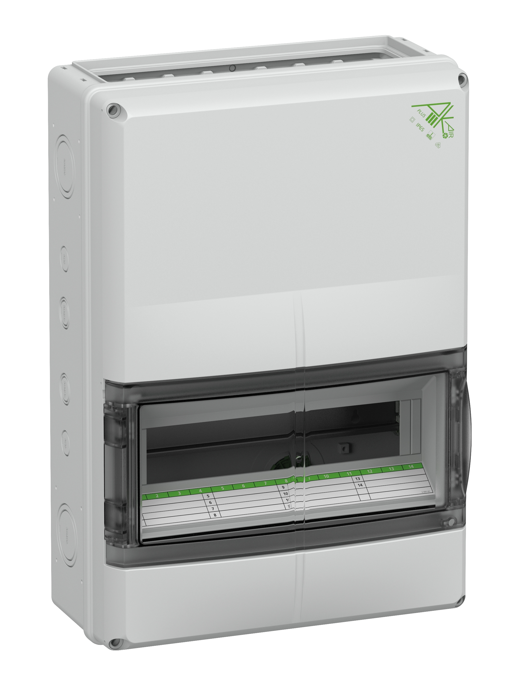 Malý rozvaděč, se stupněm krytí IP65, UL Type Rating 3R, 12/12K, Typ příruby, s integrovanými ventilačními prvky pro zmírnění vytváření kondenzační vody, Domezovací provozní napětí: 400V AC, Domezovací izolační napětí: 1000V AC, 1500V DC, Certifikováno VDE (DIN EN 60670-1/-24 (VDE 0606-1/-24)), UL (UL 50 & CSA 22.2 No. 94.1-07, UL 50E & CSA C22.2 No. 94.2-07), UL-EU (EN 62208), UL-EU (EN 61439-1/-2), UL-EU (EN 61439-1/-3), UL-EU (EN 61439-1 & EN IEC 61439-7), DLG (odolnost vůči čpavku), nahoře a dole otevřené bočnice pro montáž různých přírub nebo pro spojování různých AK-F skříní pomocí spojovací příruby, pro standardní instalace ve vnitřním prostoru a chráněném venkovním prostředí, 1-řadý, 14 modulů, s dodatečným propojovacím prostorem vč. lišty 35 mm2 bez upínací lišty PE/NRozměry: 315 x 450 x 155 mm