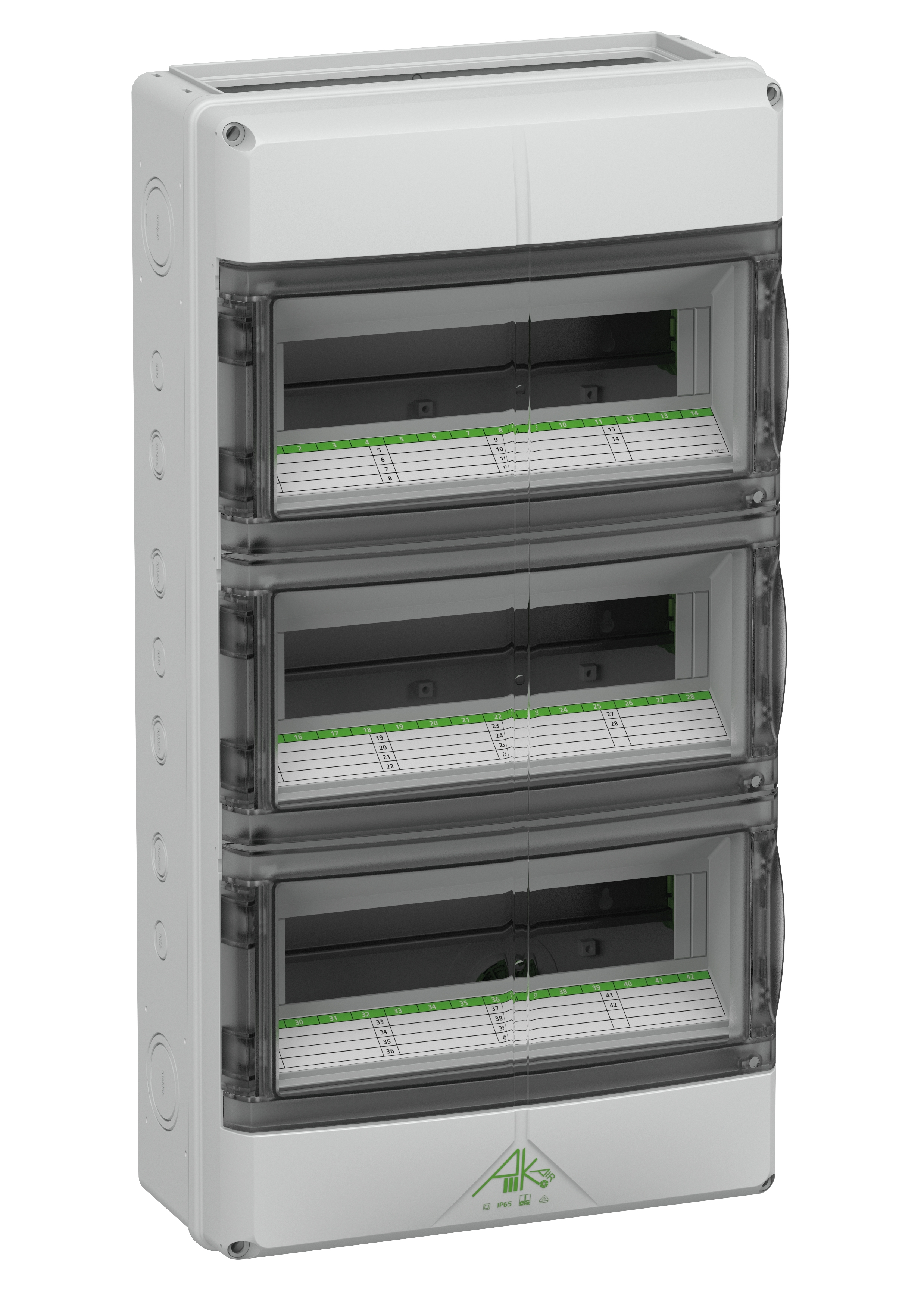 Malý rozvaděč, se stupněm krytí IP65, UL Type Rating 3R, 12/12K, Typ příruby, s integrovanými ventilačními prvky pro zmírnění vytváření kondenzační vody, Domezovací provozní napětí: 400V AC, Domezovací izolační napětí: 1000V AC, 1500V DC, Certifikováno VDE (DIN EN 60670-1/-24 (VDE 0606-1/-24)), UL (UL 50 & CSA 22.2 No. 94.1-07, UL 50E & CSA C22.2 No. 94.2-07), UL-EU (EN 62208), UL-EU (EN 61439-1/-2), UL-EU (EN 61439-1/-3), UL-EU (EN 61439-1 & EN IEC 61439-7), DLG (odolnost vůči čpavku), nahoře a dole otevřené bočnice pro montáž různých přírub nebo pro spojování různých AK-F skříní pomocí spojovací příruby, pro standardní instalace ve vnitřním prostoru a chráněném venkovním prostředí, 3-řadá, 42 modulů, bez upínací lišty PE/NRozměry: 315 x 600 x 155 mm