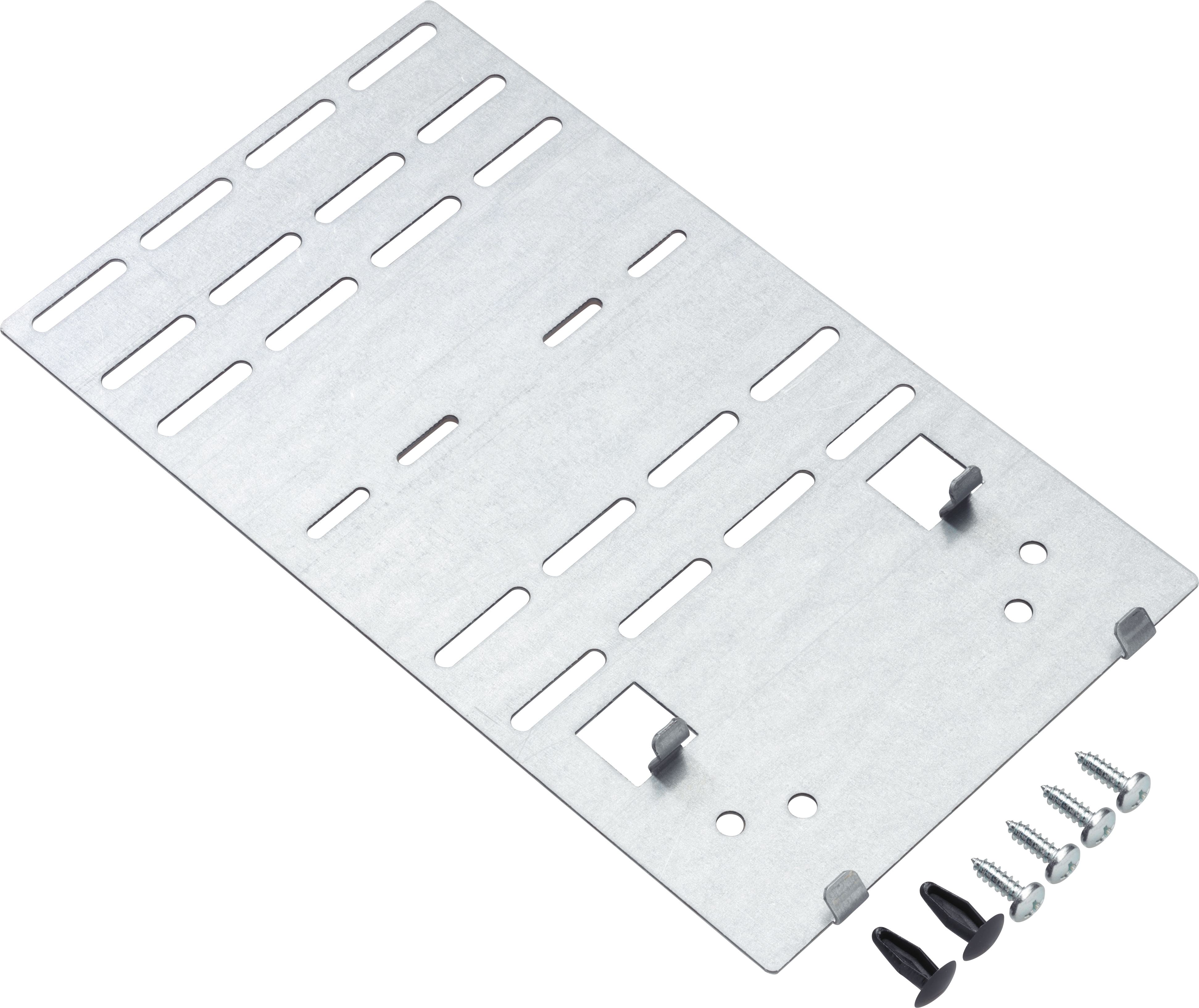 Montážní deska z ocelového plechu, včet. upevňovacích šroubů, k montáži na kabelové žlaby Stago/van Geel, k uchycení spojovacích krabic Abox, vzdálenost připevnění až 130 mm2 Rozměry: 150 x 3 x 249 mm