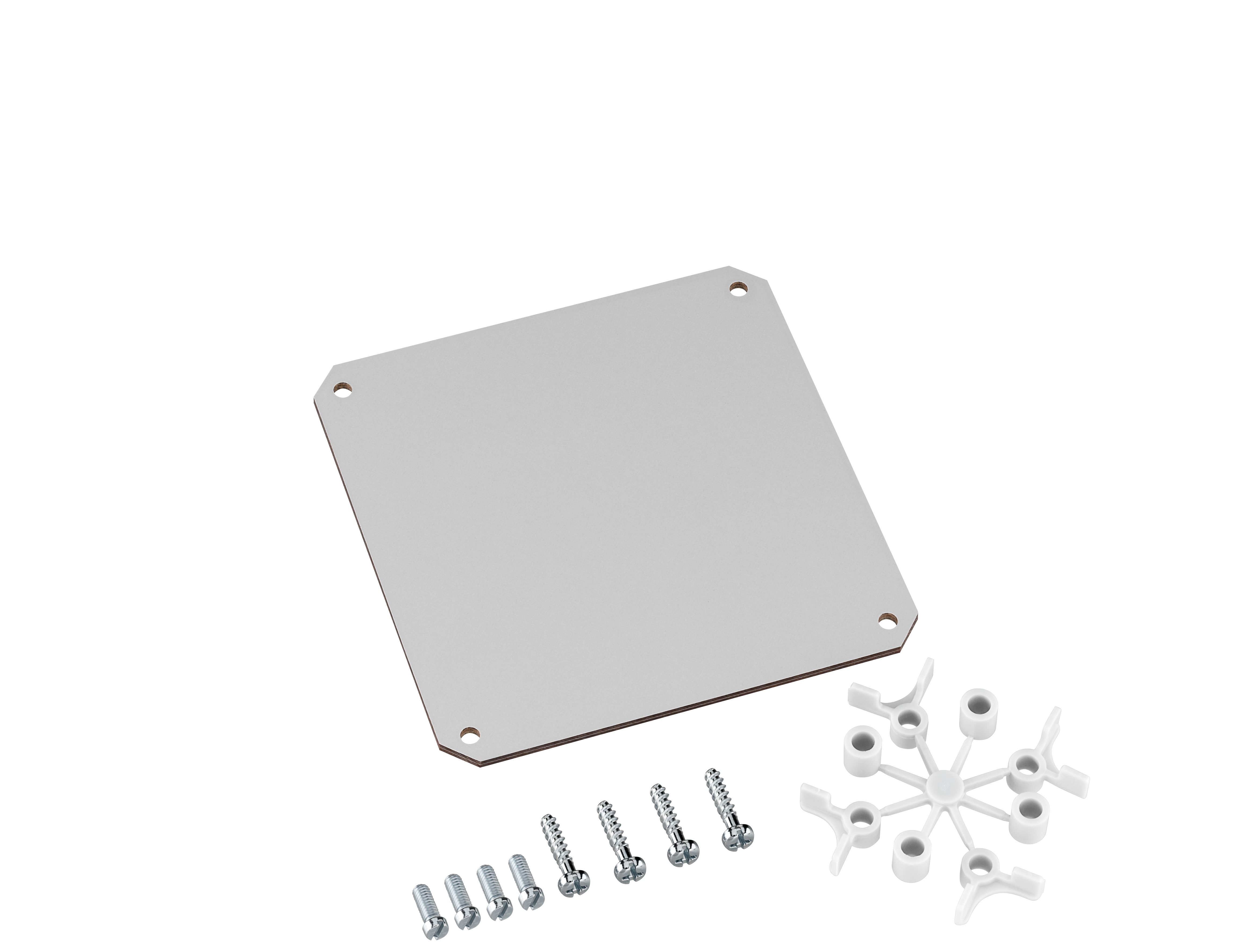 Montážní deska z izolačního materiálu kašírovaného melaminem, tloušťka 2,5 mm2 vč. upevňovacích šroubů a distančních držáků, šedá, TK PS / TK PC 1313Rozměry: 110 x 110 x 2,5 mm