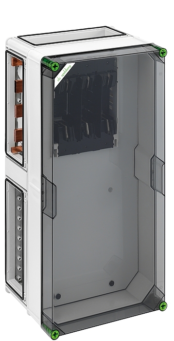 NH skříň pro jezdcové pojistky, 1 x NH 2 spodek jezdcové pojistky, Šroubovací přípojka M10, Výstup dole, na sběrnici, 5 pólů, N svorka 16 - 120 mm2, PE svorka 16 - 120 mm2, 4 x spojovací prvek (GGV), na systém přípojnic 630 A, s transparentním víkemRozměry: 320 x 640 x 254 mm