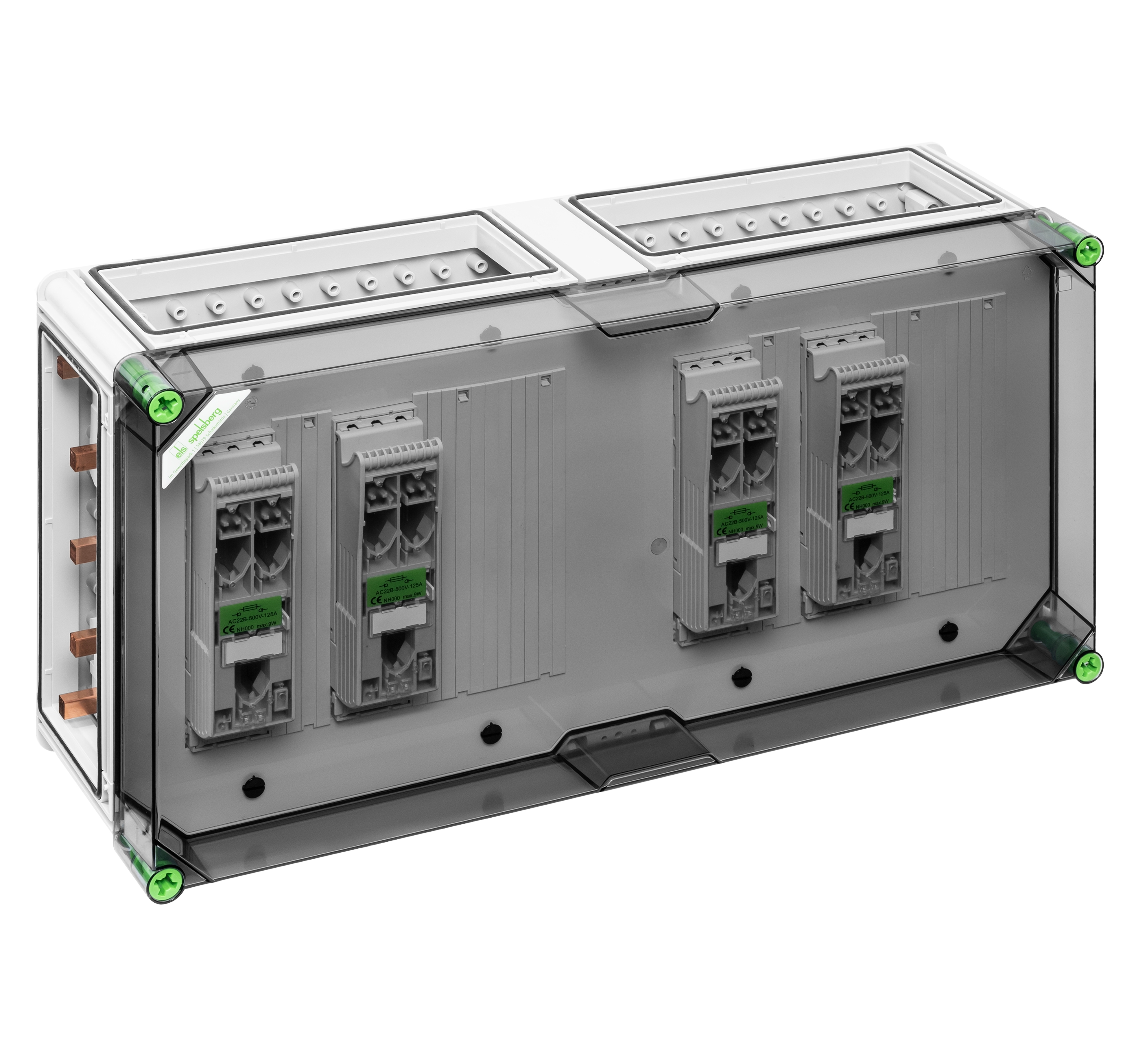 NH skříň pro jezdcové odpínače, 4 x NH 000 jezdcový pojistkový odpínač, výtahová svorka 1,5 - 50 mm2, Univerzální výstup, spodní boční vývod, 5 pólů, s 5 přípojnicovými svorkami 16 - 70 mm2, N svorka 4 - 35 mm2, PE svorka 4 - 35 mm2, 3 x spojovací prvek (GGV), Systém přípojnic 630 A, s transparentním víkemRozměry: 640 x 320 x 179 mm