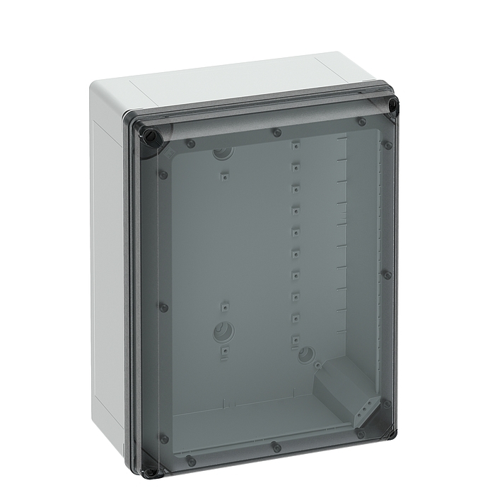 Prázdná skříň, vhodné pro instalaci v zátěžovém prostředí a v nechráněném venkovním prostředí, Krabice: polykarbonát vyztužený skleněnými vlákny, šedá, podobně RAL 7035, Víko: Polykarbonát, s transparentním víkemRozměry: 300 x 400 x 180 mm