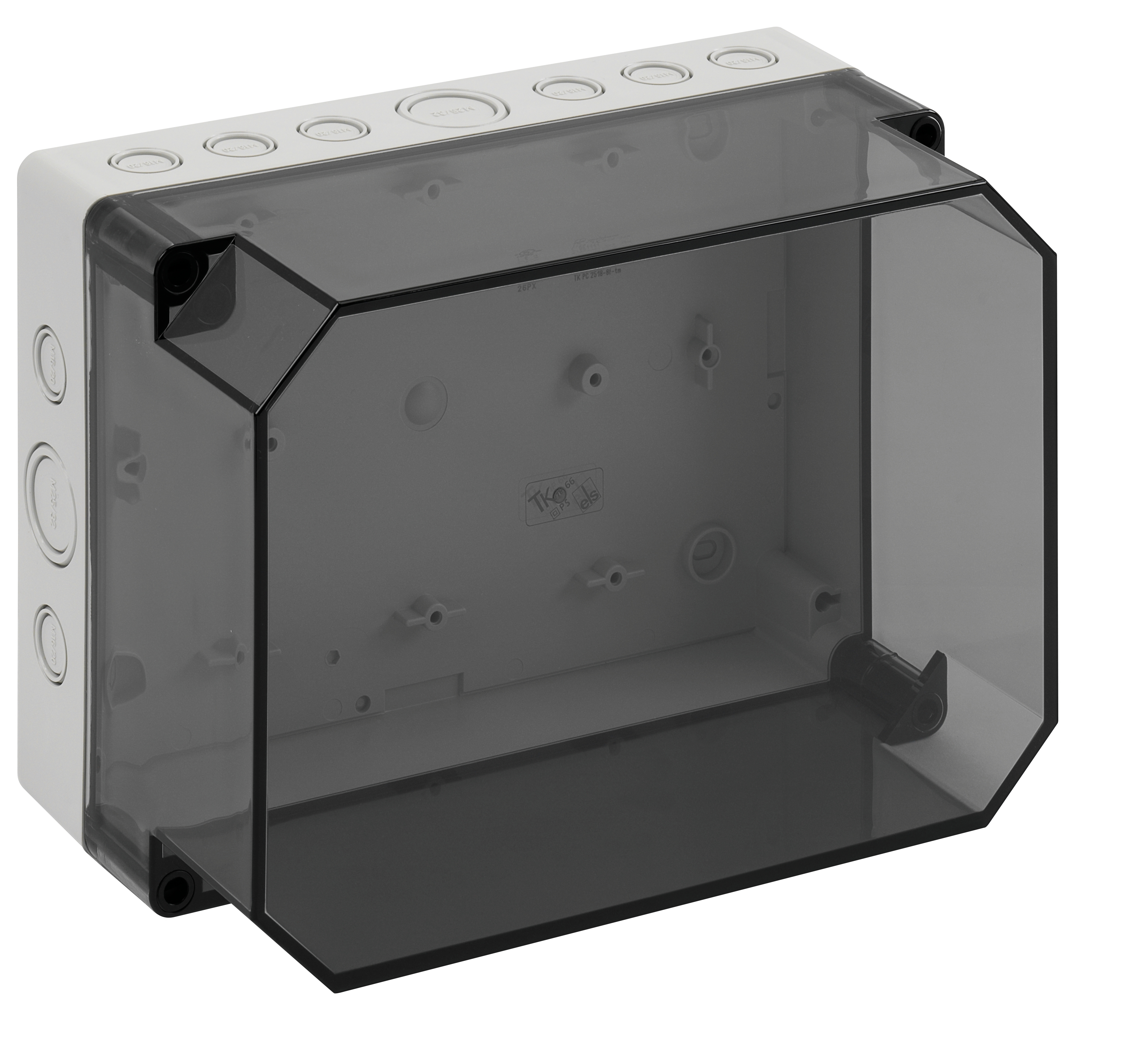 Prázdná skříň, se stupněm krytí IP66, polystyren, Ui=690V AC, Ui=1000V DC, Vnitřní místa pro připevnění, pro standardní instalace ve vnitřním prostoru, Krabice: polystyren, šedá, Víko: polykarbonát, transparentní, Vyrážecí membrány, M16/M20/M25/M32, (20 vývodek z boku)Rozměry: 254 x 180 x 137 mm