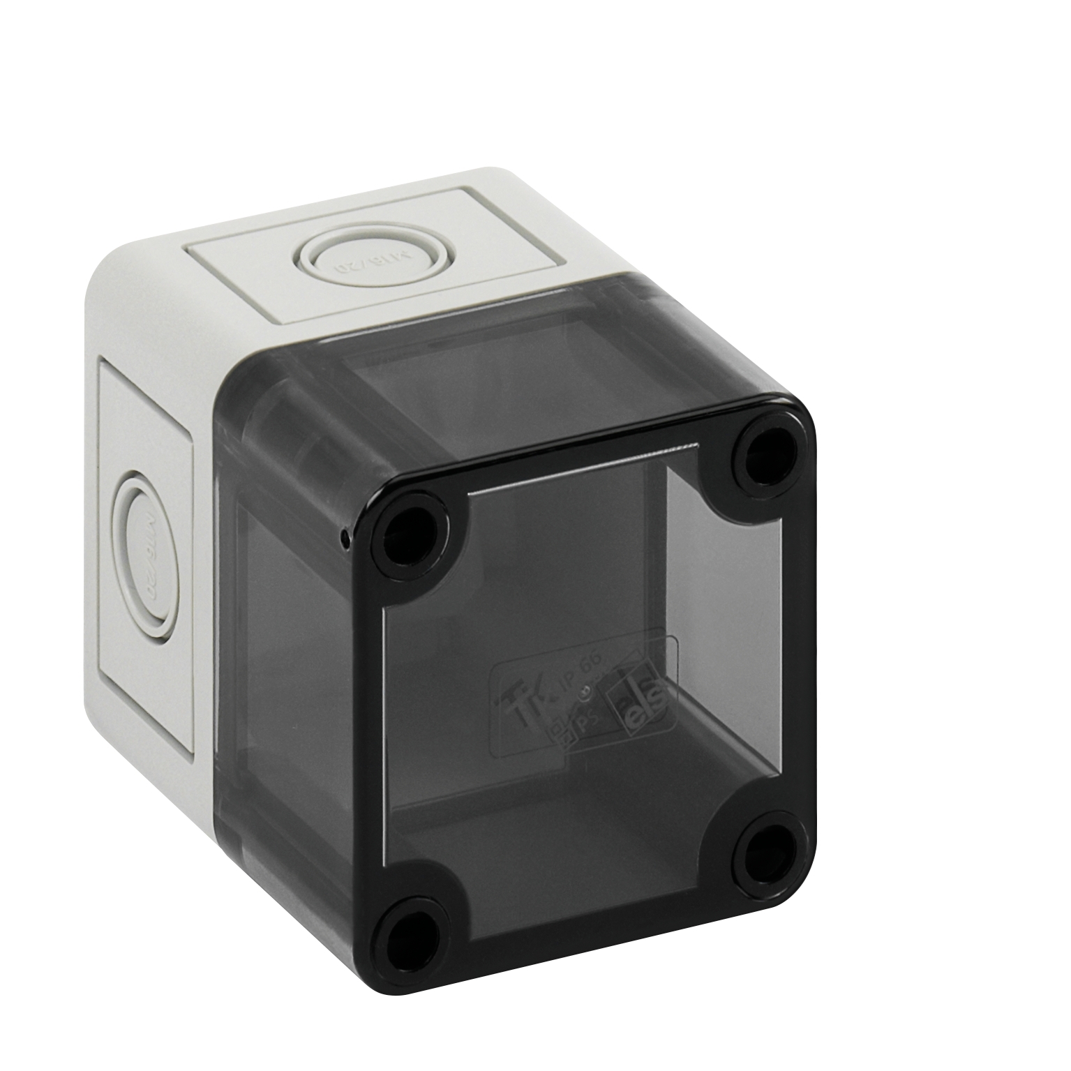 Prázdná skříň, se stupněm krytí IP66, polystyren, Ui=690V AC, Ui=1000V DC, Vnitřní místa pro připevnění, pro standardní instalace ve vnitřním prostoru, Krabice: polystyren, šedá, Víko: polykarbonát, transparentní, Vyrážecí membrány, M16/M20, (4 vývodek z boku)Rozměry: 65 x 65 x 81 mm