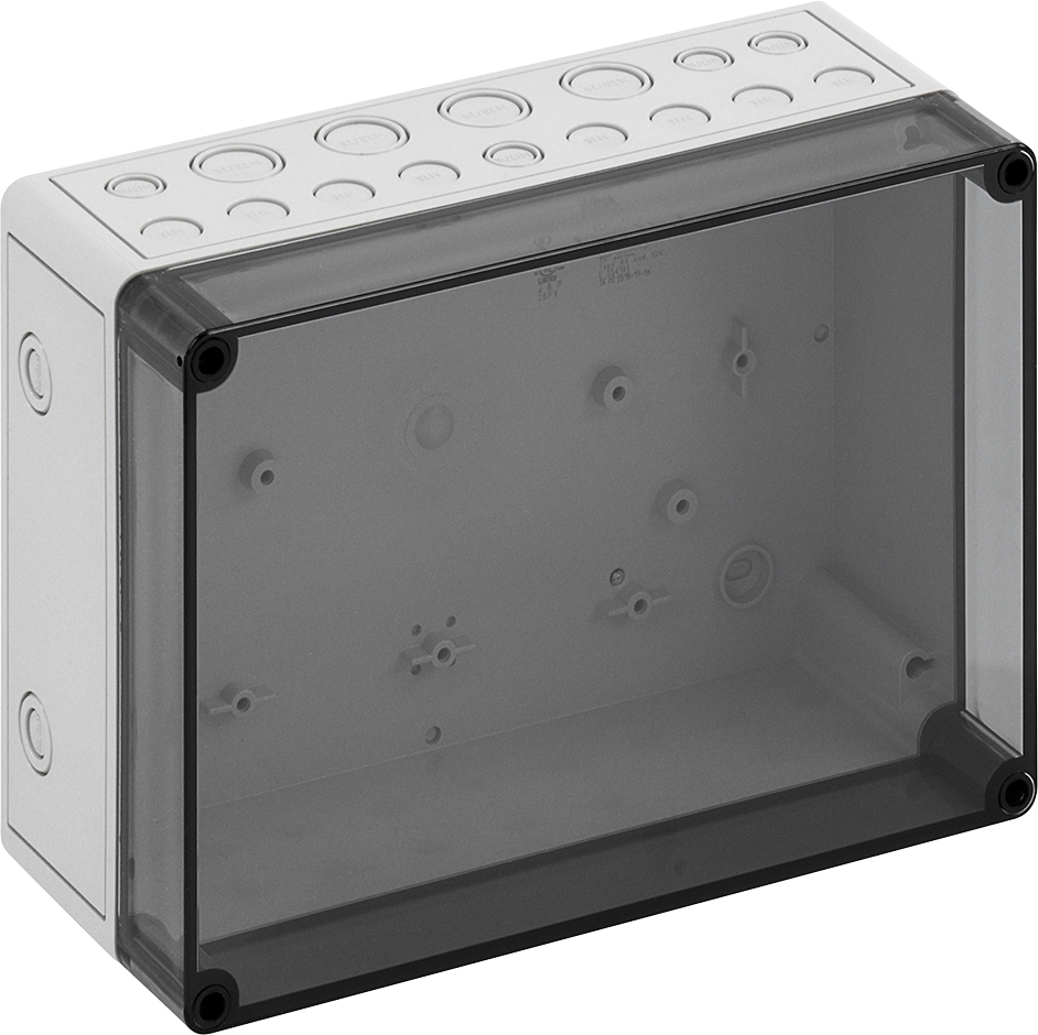 Prázdná skříň, se stupněm krytí IP66, polykarbonát, Ui=690V AC, Ui=1000V DC, Vnitřní místa pro připevnění, pro instalace v průmyslovém prostředí a chráněném venkovním prostředí, Krabice: polykarbonát, šedá, Víko: polykarbonát, transparentní, Vyrážecí membrány, M12/M16/M20/M25, (38 vývodek z boku)Rozměry: 254 x 180 x 111 mm