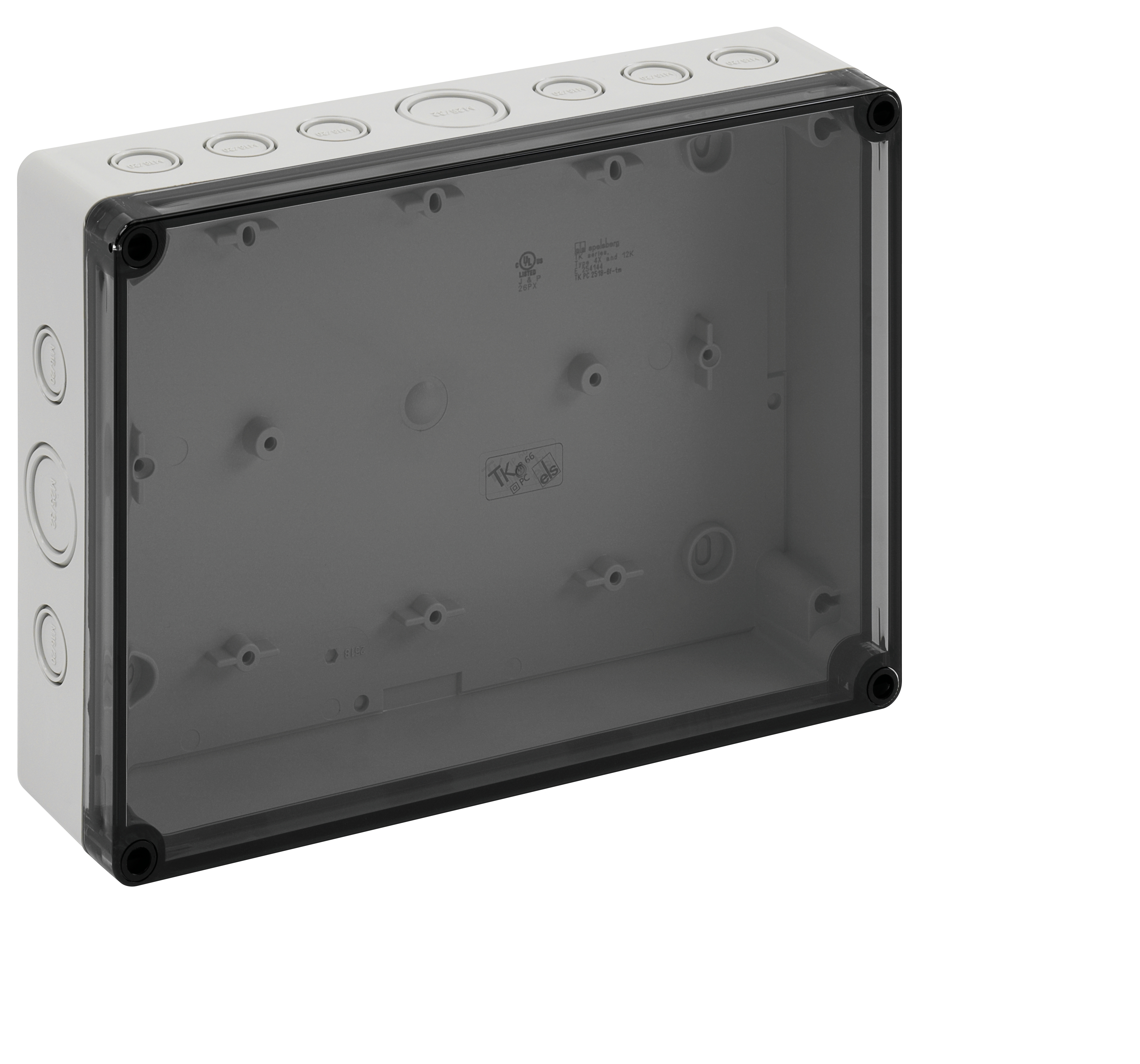 Prázdná skříň, se stupněm krytí IP66, polykarbonát, Certifikováno UL (UL 50 & CSA 22.2 No. 94.1-07, UL 50E & CSA C22.2 No. 94.2-07), DLG (odolnost vůči čpavku), DNV (Třída: Lodě & offshore zařízení), Ui=690V AC, Ui=1000V DC, Vnitřní místa pro připevnění, pro instalace v průmyslovém prostředí a chráněném venkovním prostředí, Krabice: polykarbonát, šedá, Víko: polykarbonát, transparentní, Vyrážecí membrány, M16/M20/M25/M32, (20 vývodek z boku)Rozměry: 254 x 180 x 63 mm