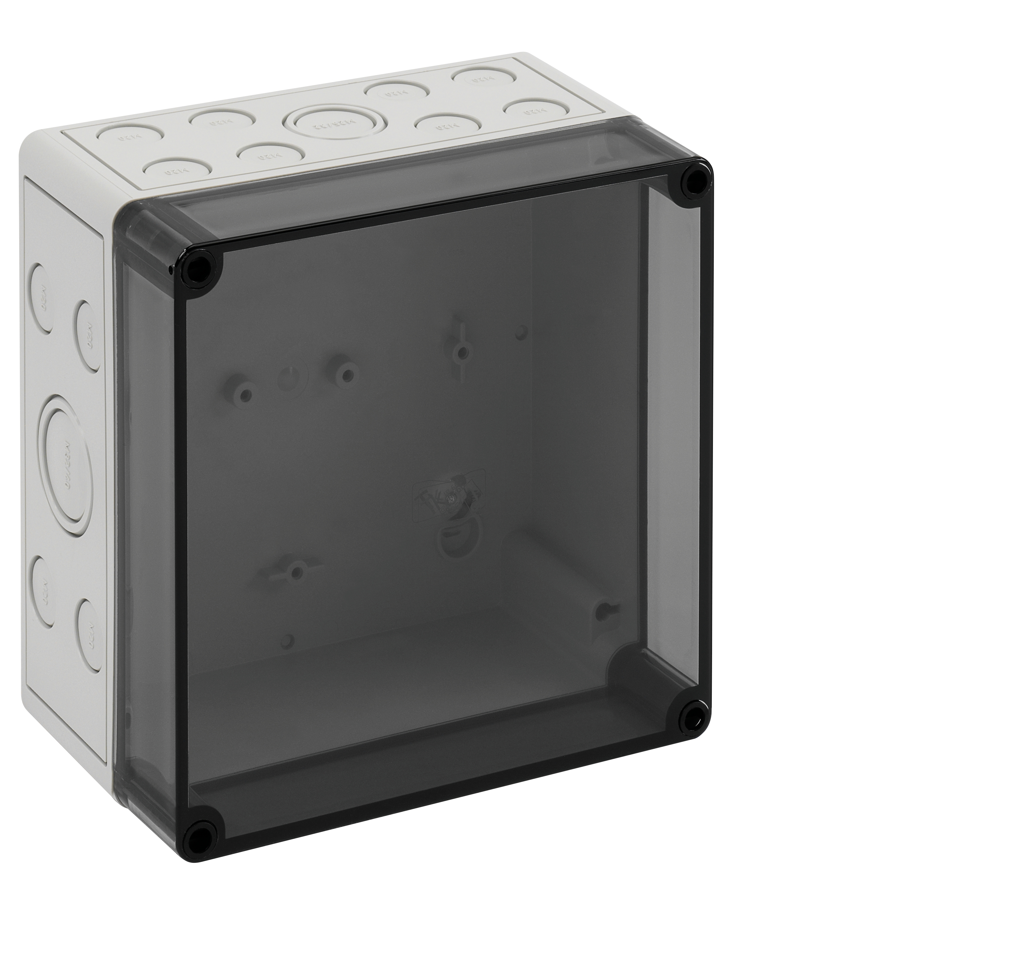 Prázdná skříň, se stupněm krytí IP66, polykarbonát, Certifikováno UL (UL 50 & CSA 22.2 No. 94.1-07, UL 50E & CSA C22.2 No. 94.2-07), DLG (odolnost vůči čpavku), DNV (Třída: Lodě & offshore zařízení), Ui=690V AC, Ui=1000V DC, Vnitřní místa pro připevnění, pro instalace v průmyslovém prostředí a chráněném venkovním prostředí, Krabice: polykarbonát, šedá, Víko: polykarbonát, transparentní, Vyrážecí membrány, M20/M32/M40, (28 vývodek z boku)Rozměry: 182 x 180 x 111 mm