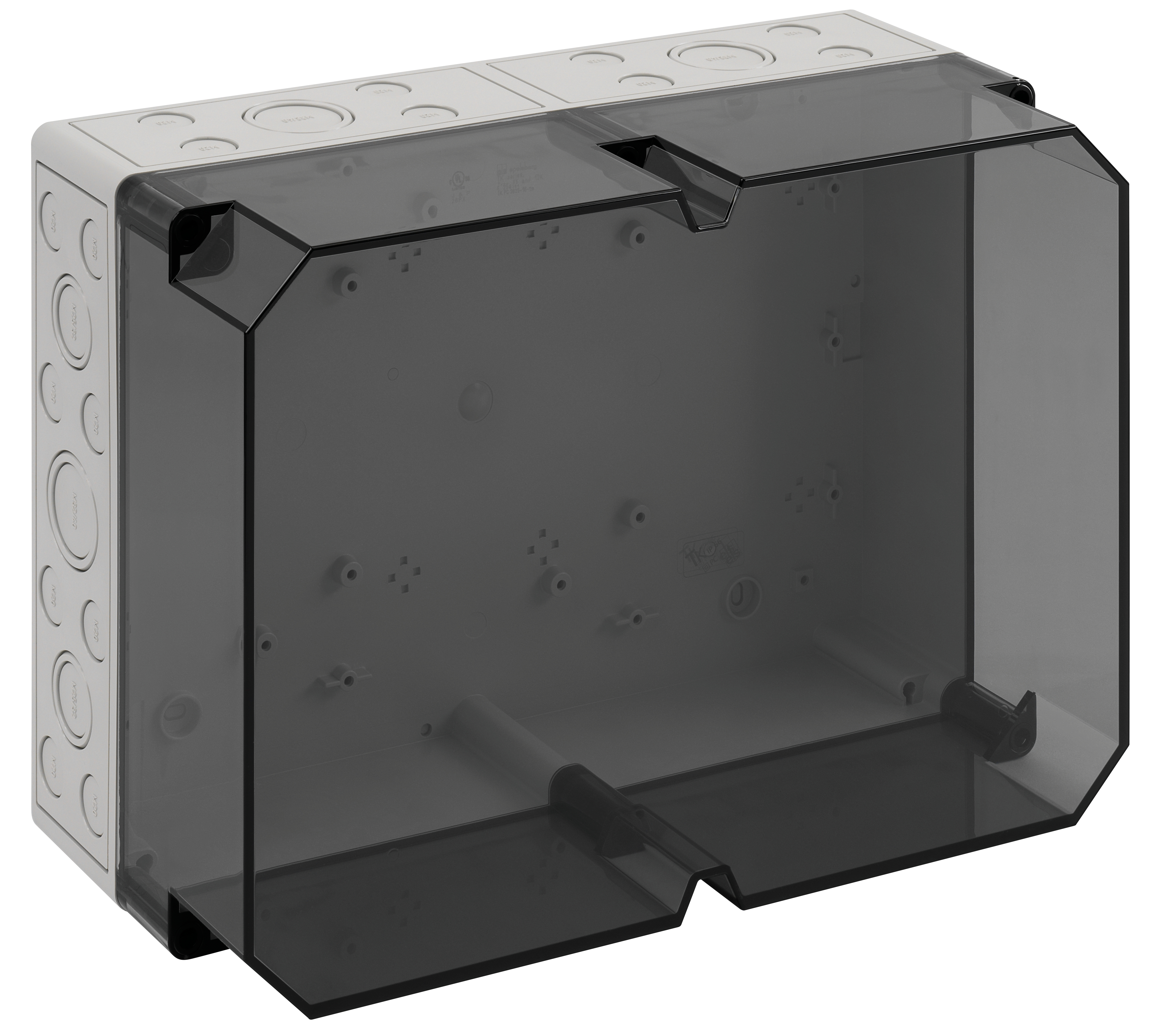 Prázdná skříň, se stupněm krytí IP66, polykarbonát, Certifikováno UL (UL 50 & CSA 22.2 No. 94.1-07, UL 50E & CSA C22.2 No. 94.2-07), DLG (odolnost vůči čpavku), DNV (Třída: Lodě & offshore zařízení), Ui=690V AC, Ui=1000V DC, Vnitřní místa pro připevnění, pro instalace v průmyslovém prostředí a chráněném venkovním prostředí, Krabice: polykarbonát, šedá, Víko: polykarbonát, transparentní, Vyrážecí membrány, M20/M25/M32/M40, (42 vývodek z boku)Rozměry: 361 x 254 x 165 mm