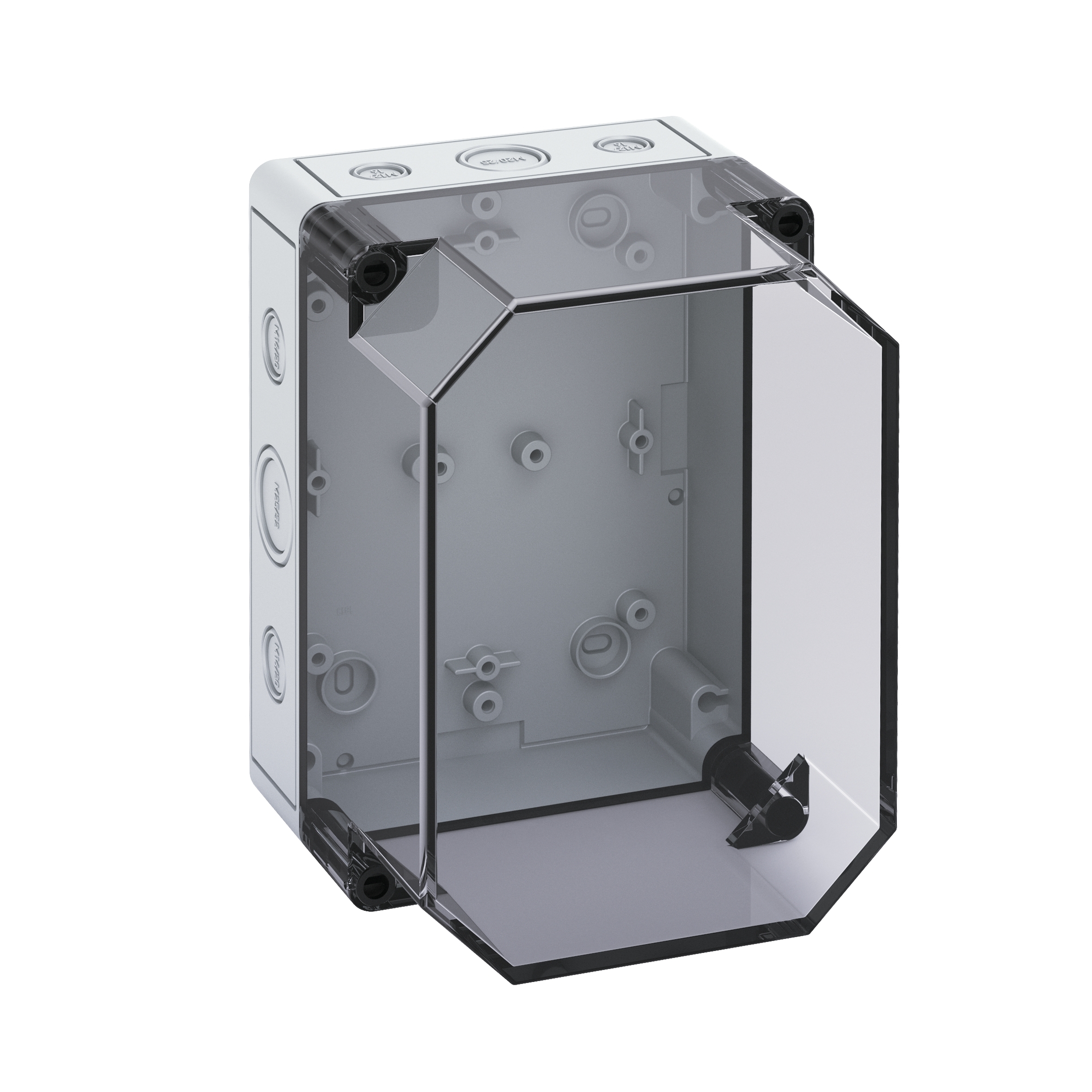 Prázdná skříň, se stupněm krytí IP66, polykarbonát, Certifikováno UL (UL 50 & CSA 22.2 No. 94.1-07, UL 50E & CSA C22.2 No. 94.2-07), DLG (odolnost vůči čpavku), DNV (Třída: Lodě & offshore zařízení), Ui=690V AC, Ui=1000V DC, Vnitřní místa pro připevnění, pro instalace v průmyslovém prostředí a chráněném venkovním prostředí, Krabice: polykarbonát, šedá, Víko: polykarbonát, transparentní, Vyrážecí membrány, M12/M16/M20/M25/M32, (14 vývodek z boku)Rozměry: 180 x 130 x 137 mm