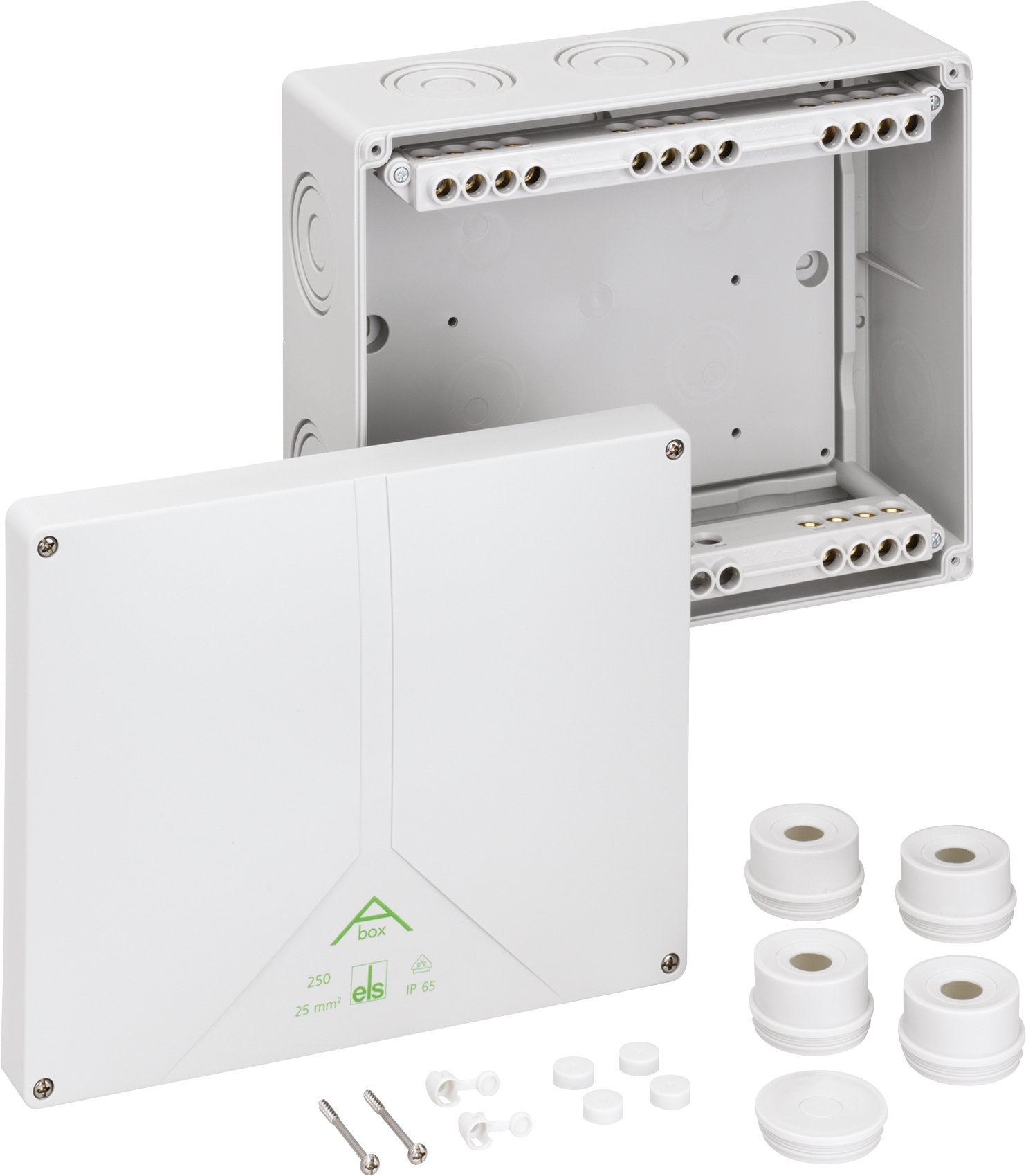 Rozbočovací krabice, IP54/IP65 , max. průřez vodiče 25mm2, rázová odolnost IK07, třída ochrany II, Ui 690V AC, VDE ABOX 250-25mm2