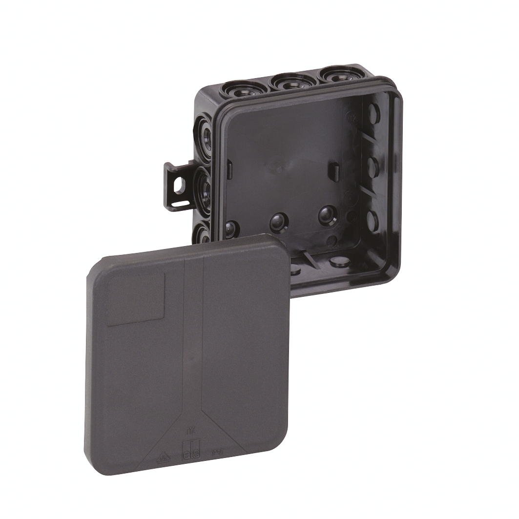 Rozbočovací krabice, se stupněm krytí IP55, Jmenovitý průřez 2,5 mm2, Ui=400 V AC, Certifikováno VDE (DIN EN 60670-1/-22 (VDE 0606-1/-22)), Samotěsnicí přívodní membrány, Rozsah těsnění 8,2 - 12,5 mm2 (3 prolis ze zadu, 12 vývodek z boku), Vnější místa pro připevnění, pro standardní instalace ve vnitřním prostoru, černá, bez svorekRozměry: 85 x 85 x 37 mm
