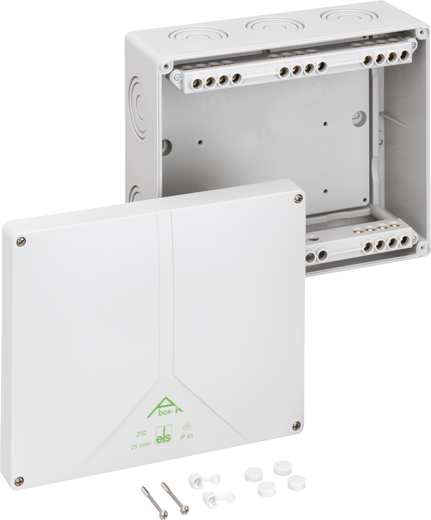 Rozbočovací krabice, se stupněm krytí IP65, Jmenovitý průřez 25 mm2, Ui=690 V AC, Certifikováno VDE (DIN EN 60670-1/-22 (VDE 0606-1/-22)), DLG (odolnost vůči čpavku), DNV (Třída: Lodě & offshore zařízení), Vyrážecí membrány, M20/M25/M32/M40/M50, (4 prolis ze zadu, 10 vývodek z boku), Vnitřní místa pro připevnění, pro instalace v průmyslovém prostředí a chráněném venkovním prostředí, šedá, s vysoko položenými šroubovými svorkami, 5-pólovými - 25 mm2 (4 x 10mm2 / 4 x 16mm2 / 4 x 25mm2)Rozměry: 250 x 200 x 115 mm2řiložené příslušenství: 1 Plombovací souprava