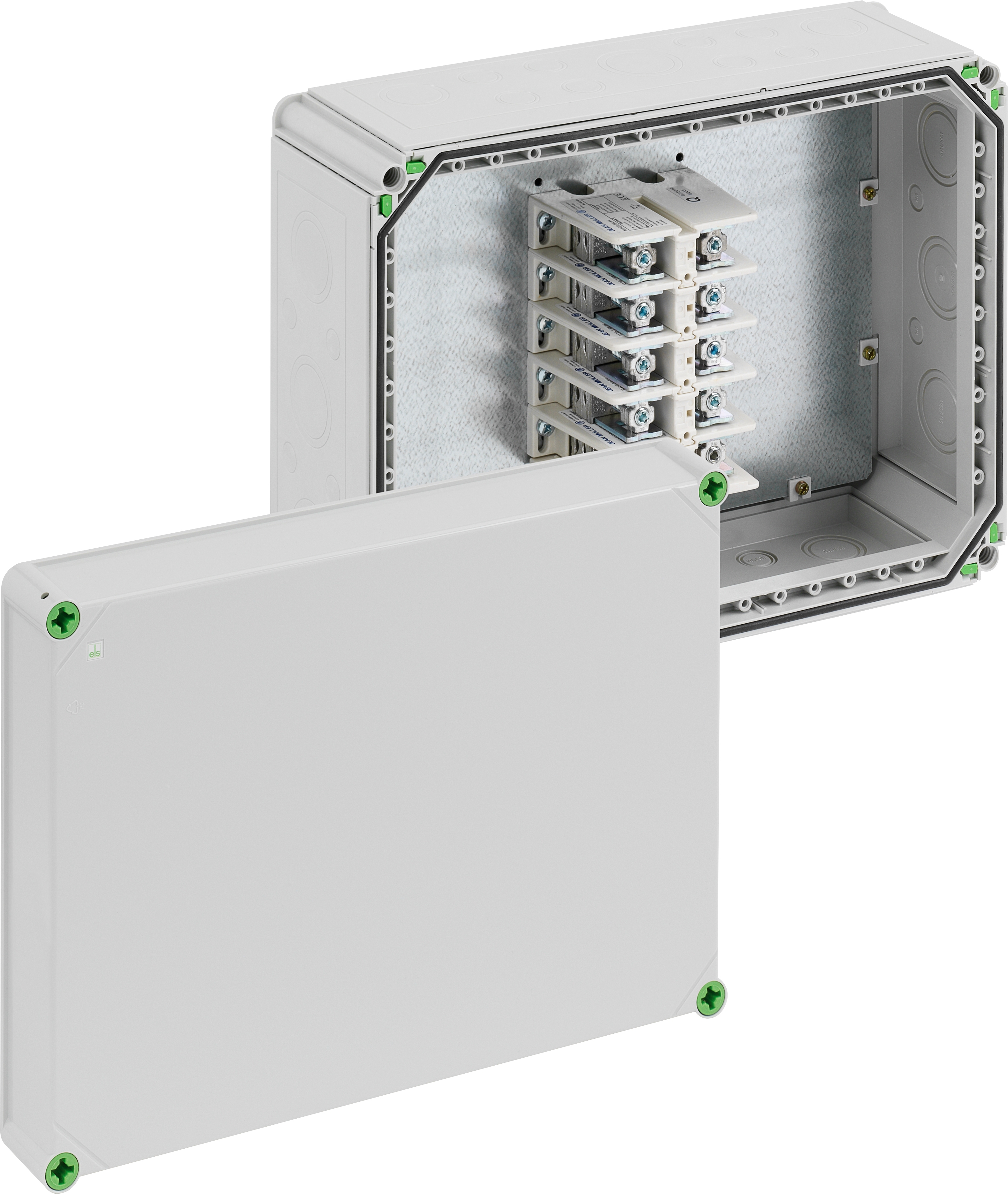 Rozbočovací krabice, se stupněm krytí IP65, Jmenovitý průřez 150 mm2, Ui=690 V AC, Vyrážecí membrány, M16/M20/M25/M32/M40/M50, (24 vývodek z boku), Vnitřní místa pro připevnění, pro instalace v průmyslovém prostředí a chráněném venkovním prostředí, šedá, se speciální šroubovou svorkou pro přívod vedení shora, 5-pólovou - 150mm2 (16 až 150 mm2, CU/AL)Rozměry: 440 x 320 x 179 mm