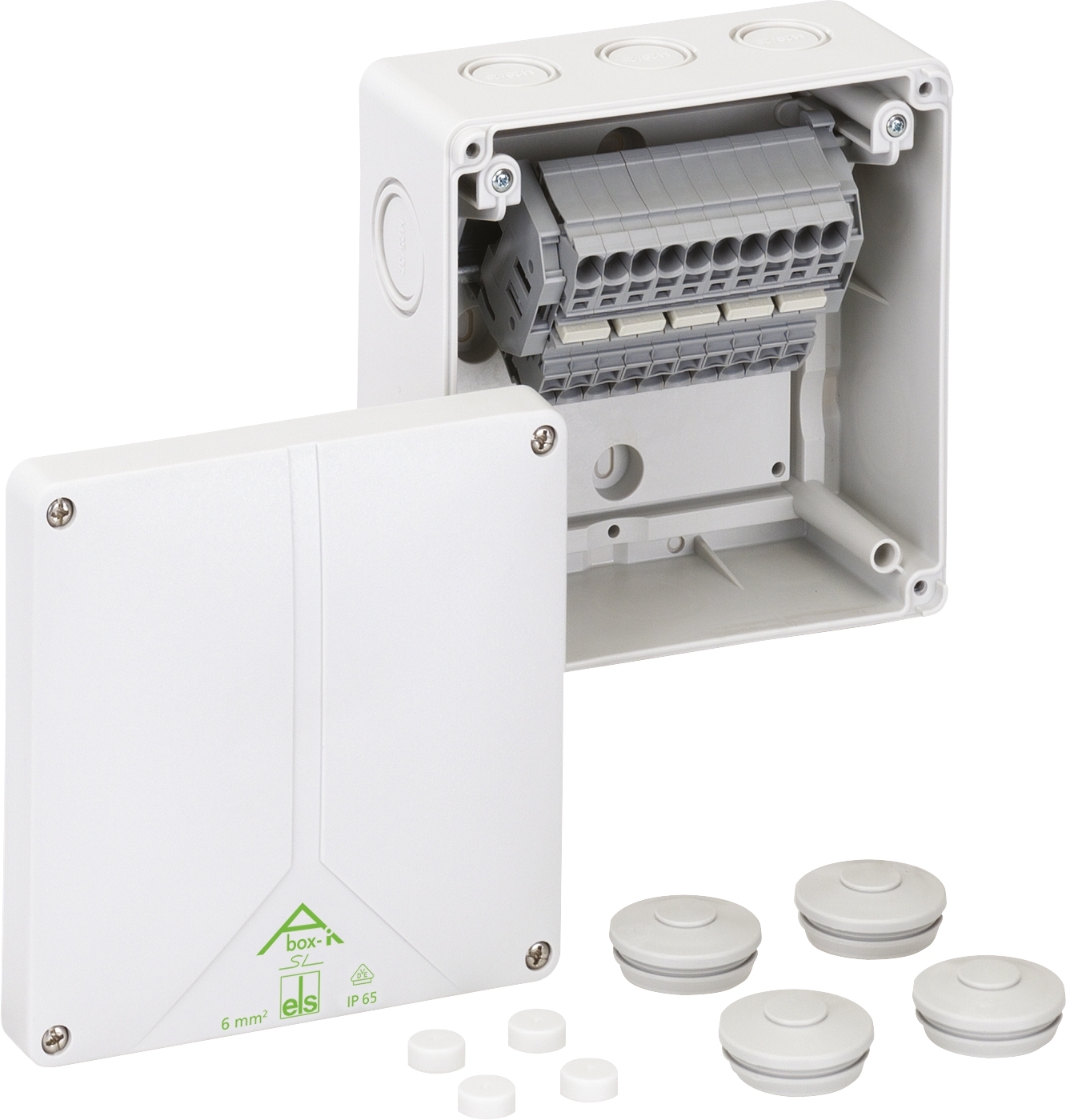 Rozbočovací krabice, IP65, max. průřez vodiče 6mm2, rázová odolnost IK08, třída ochrany II, Ui 690V AC, DLG, VDE Abox-i SL-6