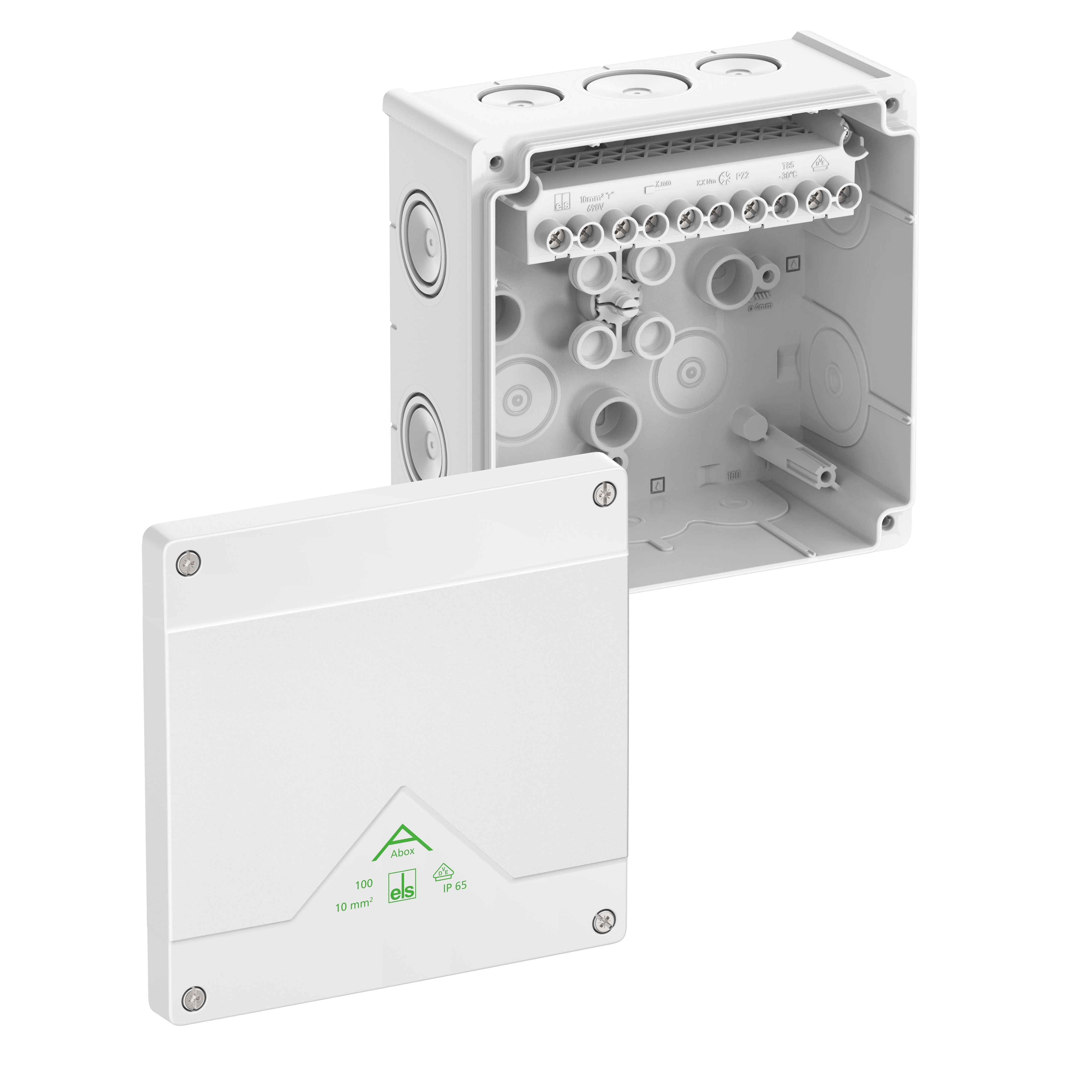 Rozbočovací krabice, IP66, max. 10mm2, rázová odolnost IK07, třída ochrany II, Ui 690V AC, Ui 690V DC, DLG, VDE Abox 100-10/w