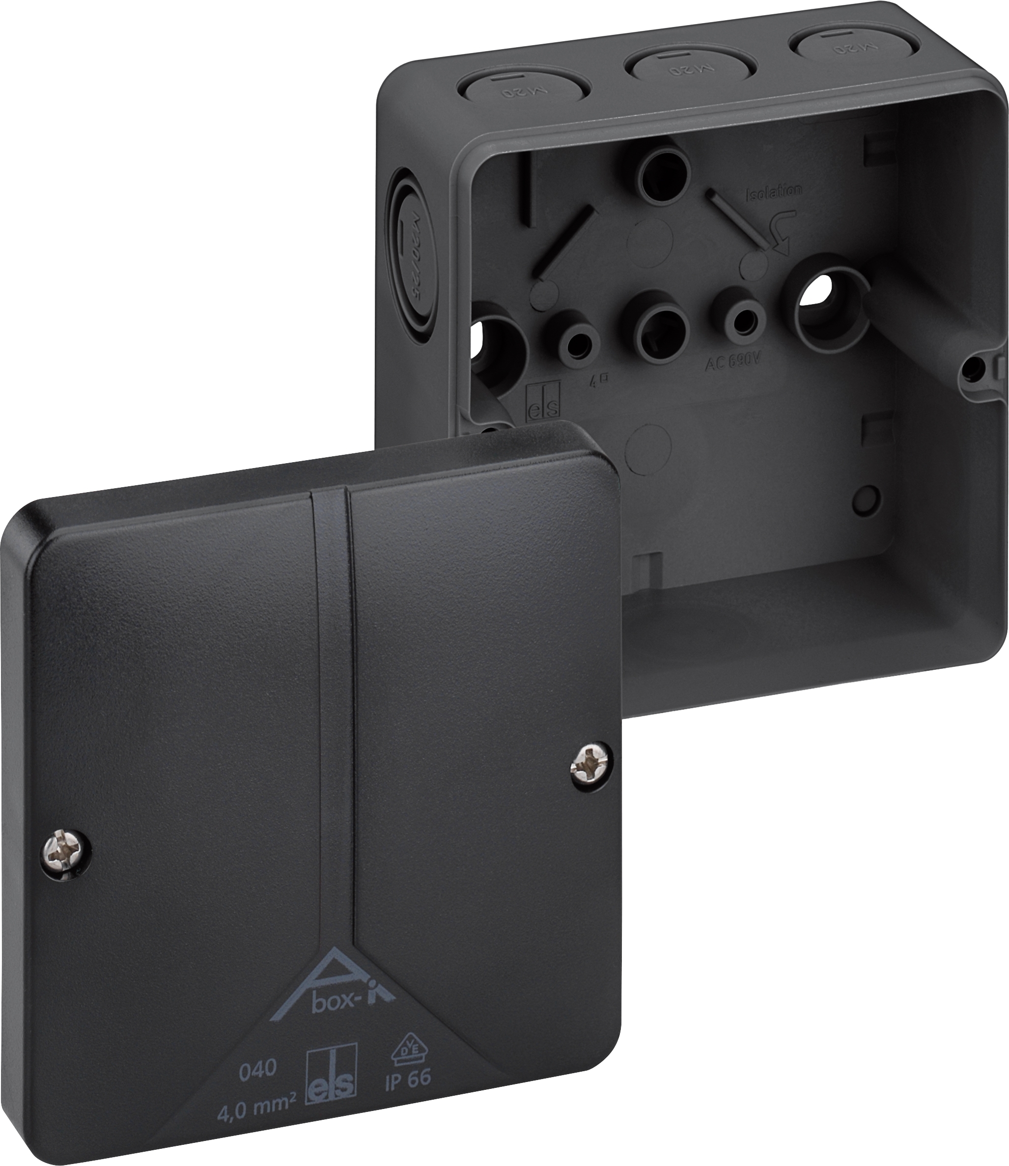 Rozbočovací krabice, se stupněm krytí IP66, Jmenovitý průřez 4 mm2, Ui=690 V AC, Certifikováno VDE (DIN EN 60670-1/-22 (VDE 0606-1/-22)), DLG (odolnost vůči čpavku), DNV (Třída: Lodě & offshore zařízení), Vyrážecí membrány, M20/M25, (1 prolis ze zadu, 8 vývodek z boku), Vnitřní místa pro připevnění, pro instalace v průmyslovém prostředí a chráněném venkovním prostředí, černá, bez svorekRozměry: 94 x 94 x 57 mm2řiložené příslušenství: 4Dvojitá membránová vývodka IP66 M25 Rozsah těsnění 9 - 16 mm