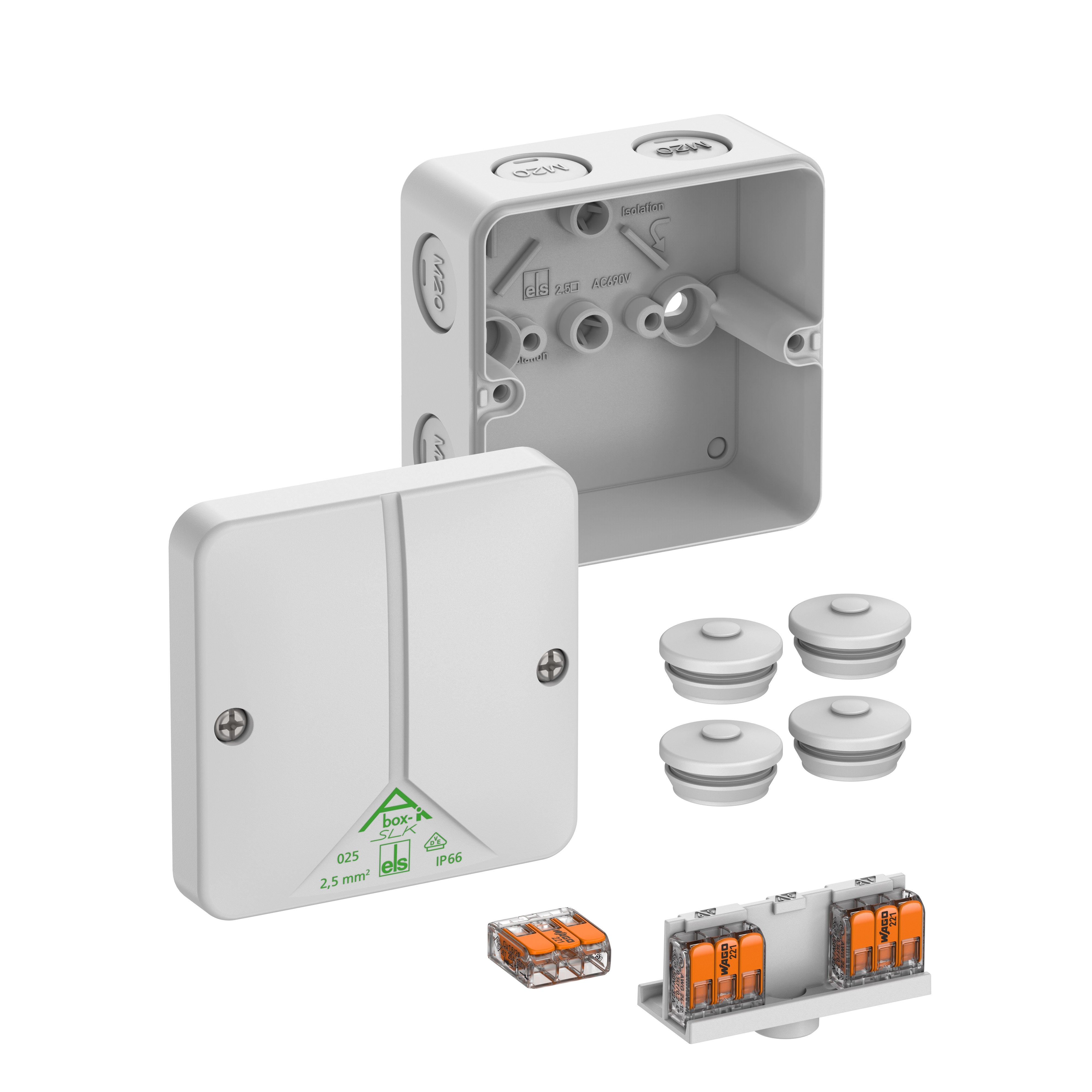 Rozbočovací krabice, se stupněm krytí IP66, Jmenovitý průřez 2,5 mm2, Ui=450 V AC, Certifikováno VDE (DIN EN 60670-1/-22 (VDE 0606-1/-22)), DLG (odolnost vůči čpavku), Vyrážecí membrány, M20, (1 prolis ze zadu, 7 vývodek z boku), Vnitřní místa pro připevnění, s bezšroubovými svorkami pro instalace v průmyslovém prostředí a chráněném venkovním prostředí, šedá, In=24 A, s 3 na dno upevněnými, bezšroubovými 3-vodičovými svorkami Wago 221-413 - 2,5 mm2, svorkovatelné průřezy na pól: 3 x 0,2 až 2,5 mm2 pevné Cu a 3 x 0,14 až 2,5 mm2 flexibilní CuRozměry: 82 x 82 x 52 mm2řiložené příslušenství: 4dvojité membránové vývodky IP66 M20 rozsah těsnění 7 - 12 mm