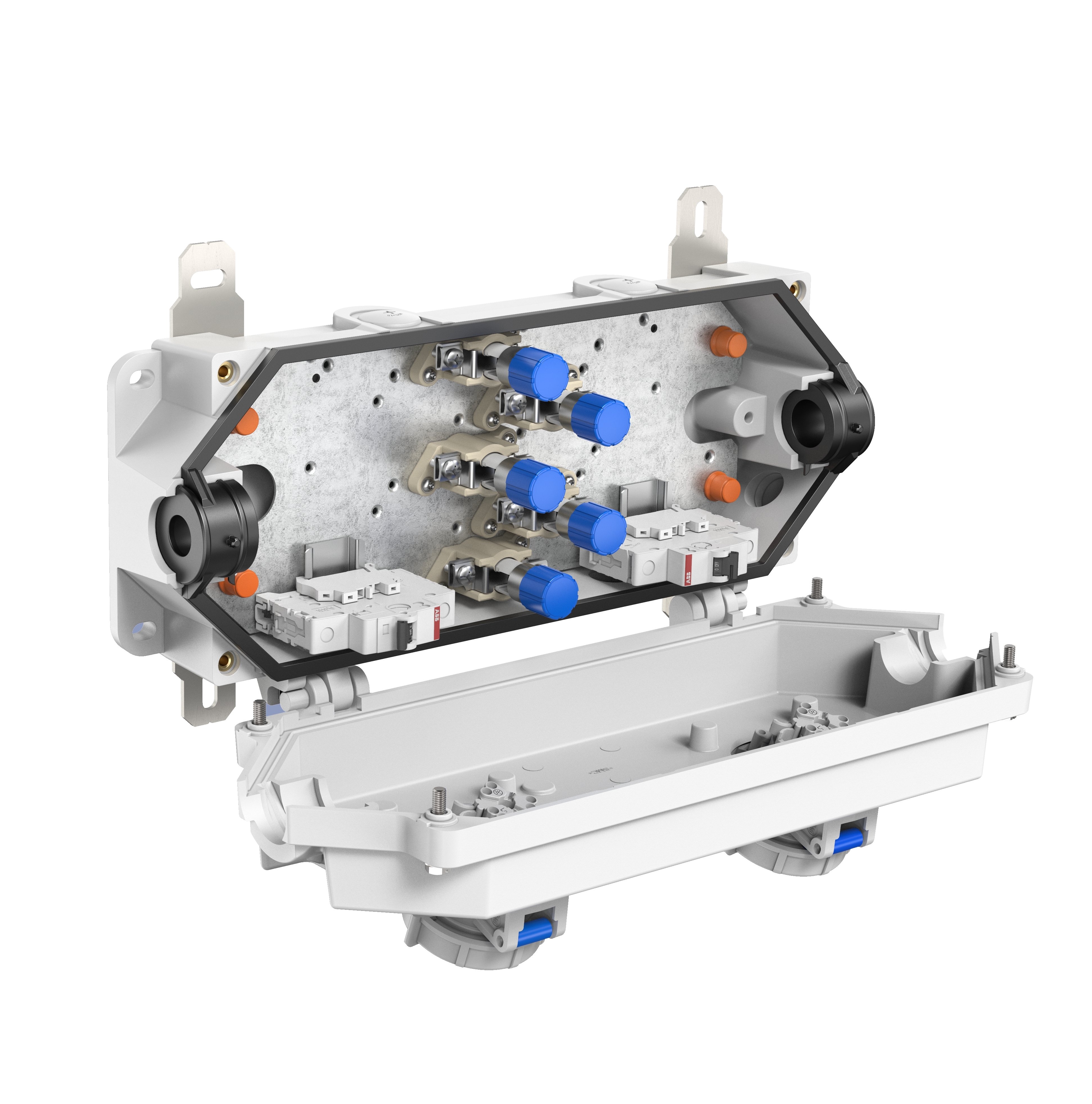 Rozbočovací krabice, se stupněm krytí IP66/IP67, Ui=400 V AC, M25, (5 vývodek z boku), Vnější místa pro připevnění, pro instalace v průmyslovém prostředí a tunelových oblastech, odolnost proti tlaku a sání podle směrnice Gotthardského tunelu. Skříň bez halogenů ze speciálního duroplastu, svorky ze speciální keramiky odolávající vysokým teplotám. Vnější úchyty a šrouby víka z nerezové oceli 1.4571, šedá, Průchod: 5-pólová svorka pro neřezané vodiče, rozsah svorky pro neřezané vodiče 2,5mm2 až 25mm2, rozsah svorky pro řezané vodiče 2,5mm2 až 16mm2, jmenovitý proud 63A. Ve víku namontované 2 ks zásuvky CEE 3-pólové 16A, jištění 2 x jističem vedení jednopólovým B10, předem zapojeným, rozsah těsnění hlavního kabelu: 17-22mm2(jiné rozsahy těsnění na dotaz)Rozměry: 190 x 447 x 105 mm2řiložené příslušenství: 2 ks kabelového šroubení M25, rozsah těsnění 9-16mm2 ks uzavíracích šroubů M25