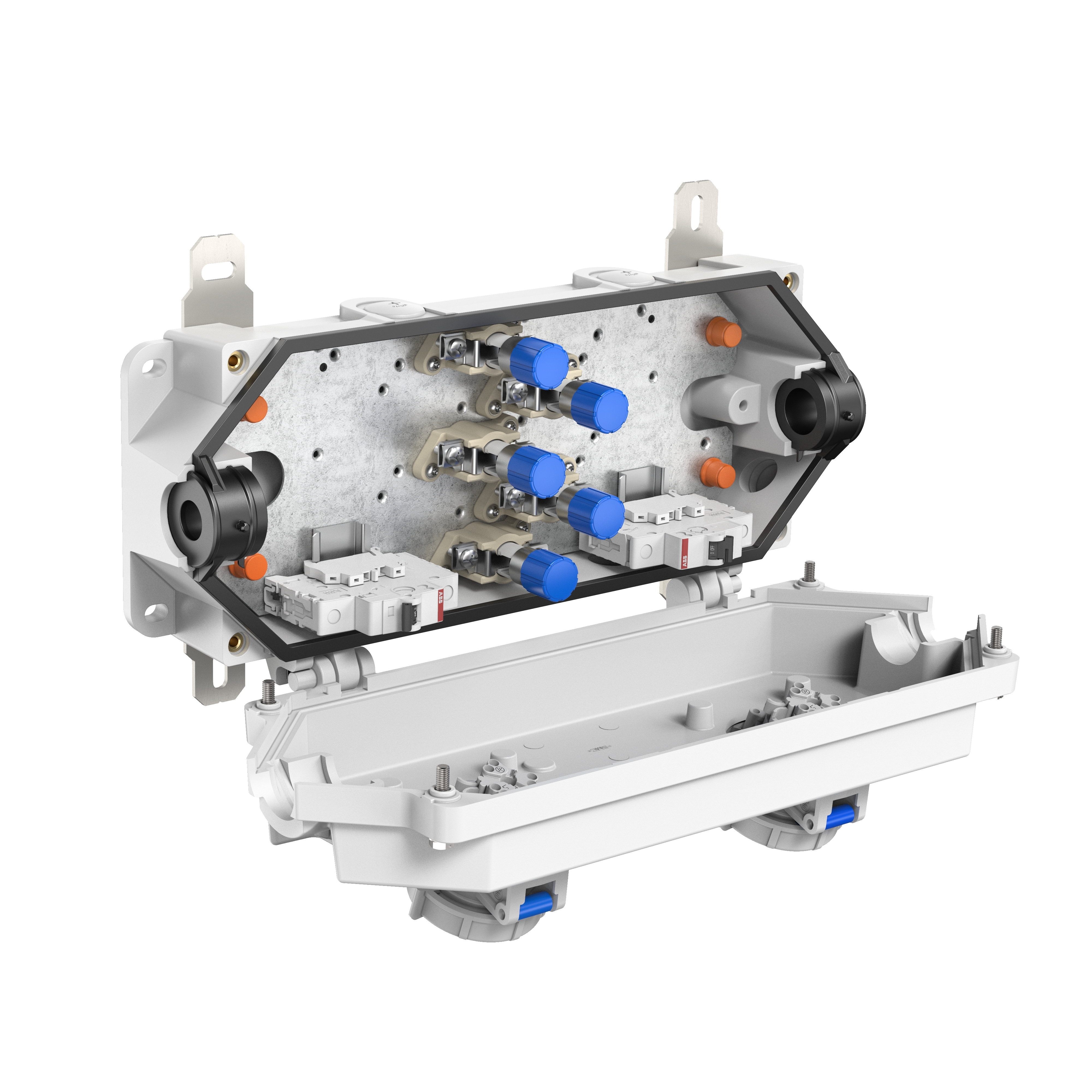 Rozbočovací krabice, se stupněm krytí IP66/IP67, Ui=400 V AC, M25, (5 vývodek z boku), Vnější místa pro připevnění, pro instalace v průmyslovém prostředí a tunelových oblastech, odolnost proti tlaku a sání podle směrnice Gotthardského tunelu. Skříň bez halogenů ze speciálního duroplastu, svorky ze speciální keramiky odolávající vysokým teplotám. Vnější úchyty a šrouby víka z nerezové oceli 1.4571, šedá, Průchod: 5-pólová svorka pro neřezané vodiče, rozsah svorky pro neřezané vodiče 16mm2 až 50mm2, rozsah svorky pro řezané vodiče 16mm2 až 35mm2, jmenovitý proud 100A. Ve víku namontované 2 ks zásuvky CEE 3-pólové 16A, jištění 2 x jističem vedení jednopólovým B10, předem zapojeným. Rozsah těsnění hlavního kabelu: 21-26mm2(jiné rozsahy těsnění na dotaz)Rozměry: 190 x 447 x 105 mm2řiložené příslušenství: 2 ks kabelového šroubení M25, rozsah těsnění 9-16mm2 ks uzavíracích šroubů M25