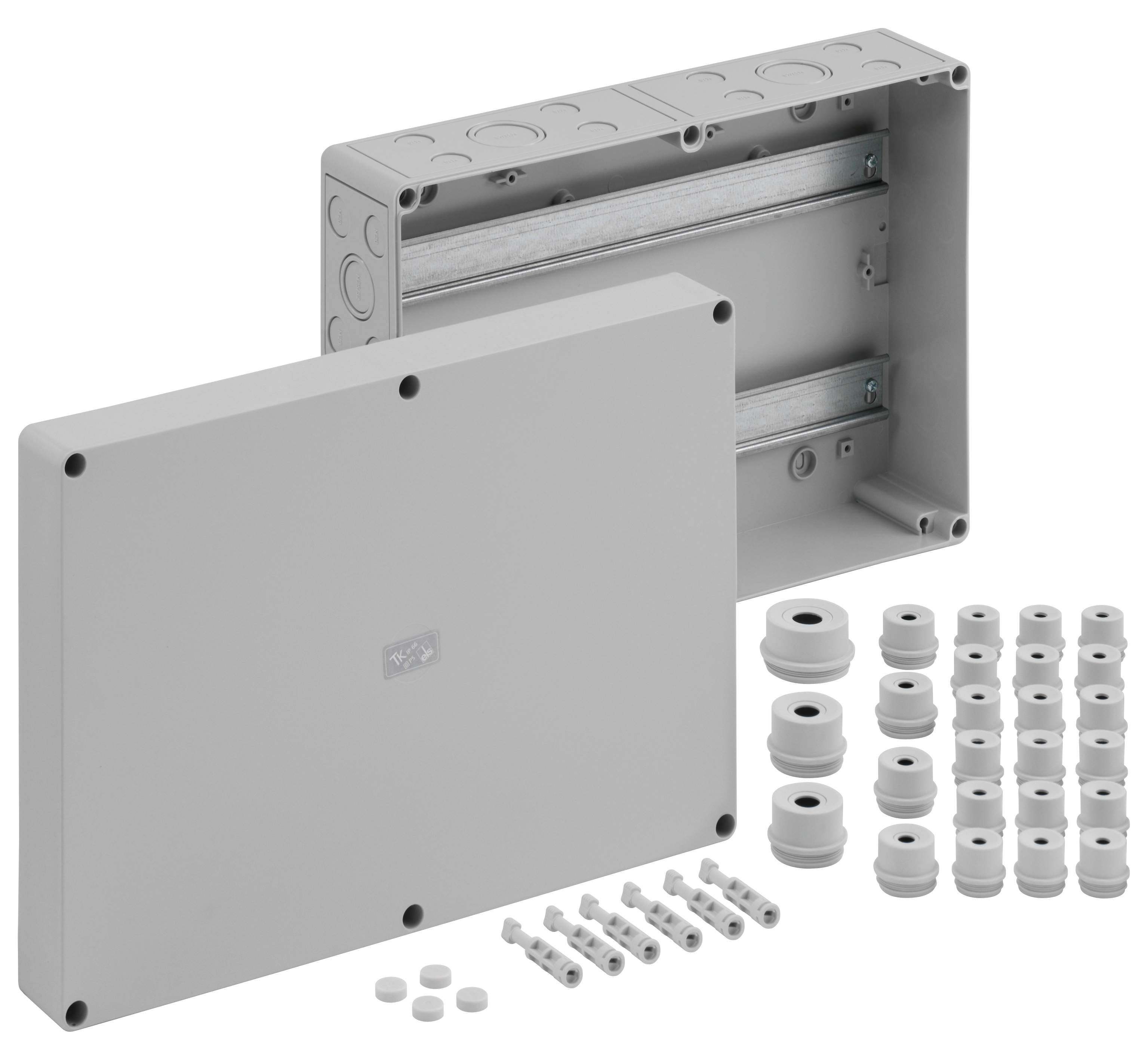 Skříň pro řadové svorkovnice, se stupněm krytí IP54/IP66, Jmenovitý průřez 4 mm2, Ui=400V AC, polystyren, Vnitřní místa pro připevnění, pro standardní instalace ve vnitřním prostoru, bez svorek, s nosnými lištami NS35Rozměry: 360 x 254 x 111 mm2řiložené příslušenství: 18 vývodek IP54 M20 Rozsah těsnění 8 - 13,5 mm2 4 vývodky IP54 M25 Rozsah těsnění 9 - 18,5 mm2 2 vývodky IP54 M32 Rozsah těsnění 13 - 23 mm2 1 Vývodka IP54 M40 Rozsah těsnění 17 - 30 mm
