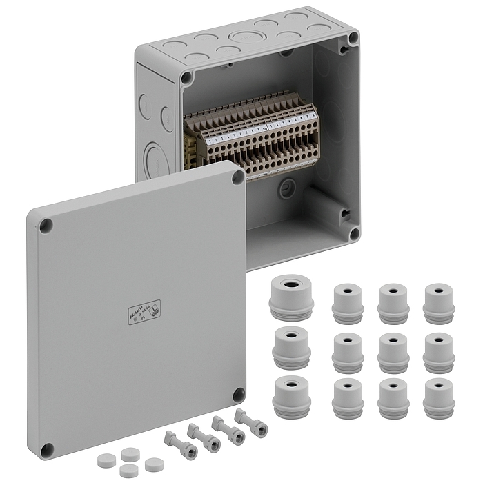 Skříň pro řadové svorkovnice, se stupněm krytí IP54/IP66, Jmenovitý průřez 4 mm2, Ui=400V AC, polykarbonát, Vnitřní místa pro připevnění, pro instalace v průmyslovém prostředí a chráněném venkovním prostředí, osazené 18 šroubovými svorkami 4 mm2 (typ Weidmüller WDU 4)Rozměry: 182 x 180 x 90 mm2řiložené příslušenství: 8 vývodek IP54 M20 Rozsah těsnění 8 - 13,5 mm2 2 vývodky IP54 M25 Rozsah těsnění 9 - 18,5 mm2 1 Vývodka IP54 M32 Rozsah těsnění 13 - 23 mm