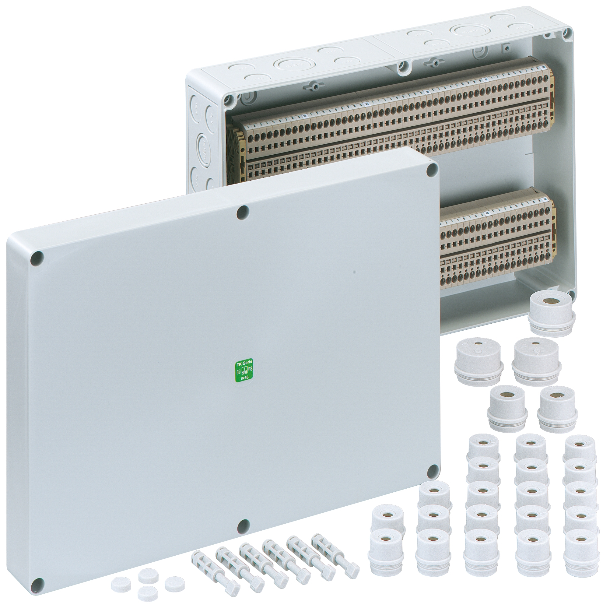 Skříň pro řadové svorkovnice, se stupněm krytí IP54/IP66, Jmenovitý průřez 4 mm2, Ui=400V AC, polykarbonát, Vnitřní místa pro připevnění, pro instalace v průmyslovém prostředí a chráněném venkovním prostředí, osazené 100 bezšroubovými svorkami 4 mm2 (typ Weidmüller ZDU 4)Rozměry: 360 x 254 x 111 mm2řiložené příslušenství: 18 vývodek IP54 M20 Rozsah těsnění 8 - 13,5 mm2 4 vývodky IP54 M25 Rozsah těsnění 9 - 18,5 mm2 2 vývodky IP54 M32 Rozsah těsnění 13 - 23 mm2 1 Vývodka IP54 M40 Rozsah těsnění 17 - 30 mm