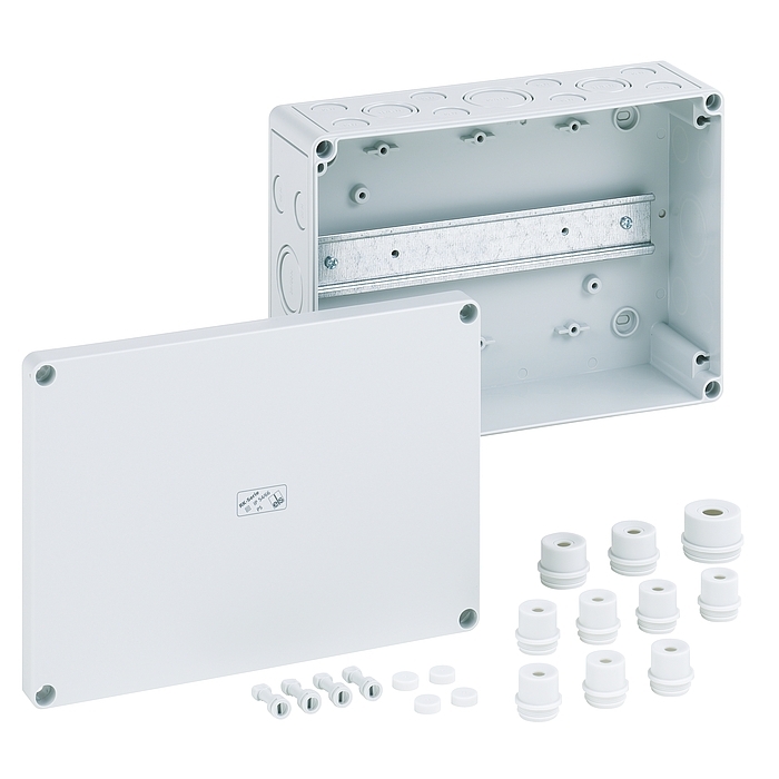 Skříň pro řadové svorkovnice, se stupněm krytí IP54/IP66, Jmenovitý průřez 4 mm2, Ui=400V AC, polykarbonát, Vnitřní místa pro připevnění, pro instalace v průmyslovém prostředí a chráněném venkovním prostředí, bez svorek, s nosnou lištou NS35Rozměry: 254 x 180 x 90 mm2řiložené příslušenství: 8 vývodek IP54 M20 Rozsah těsnění 8 - 13,5 mm2 2 vývodky IP54 M25 Rozsah těsnění 9 - 18,5 mm2 1 Vývodka IP54 M32 Rozsah těsnění 13 - 23 mm