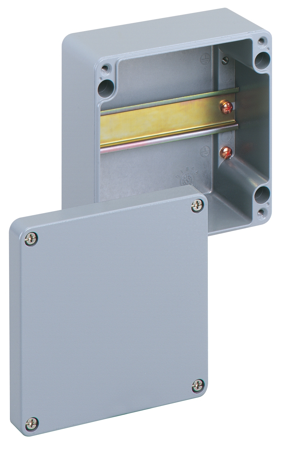 Skříň pro řadové svorkovnice, se stupněm krytí IP66, Jmenovitý průřez 4 mm2, Ui=400V AC, Hliník s práškovým lakováním, Vnitřní místa pro připevnění, pro instalace v průmyslovém prostředí a chráněném venkovním prostředí, bez svorek, s nosnou lištou NS35Rozměry: 160 x 160 x 91 mm
