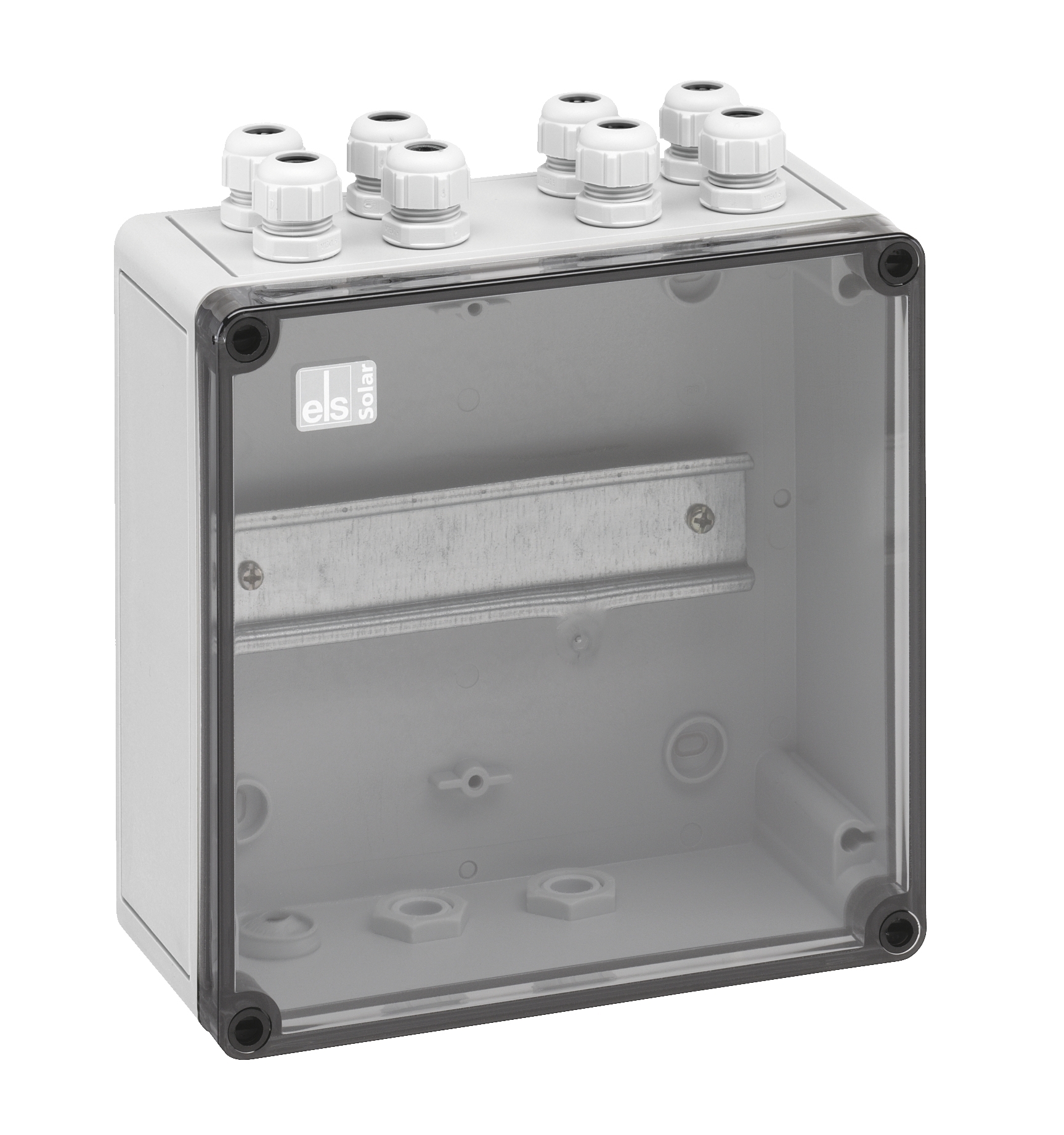 Skříň pro řadové svorkovnice, se stupněm krytí IP66, Jmenovitý průřez 6 mm2, Ui=1000V AC, polykarbonát, k použití jako sběrač DC-string pro až 4 paralelně zapojené stringy, šedá, bez svorek, s nosnými lištami NS35Rozměry: 182 x 180 x 90 mm2řiložené příslušenství: 10 kabelových vývodek M16 rozsah těsnění 4-10mm2 1 dvojitá membránová vývodka M20 rozsah těsnění 7-13mm2 izolační krytka