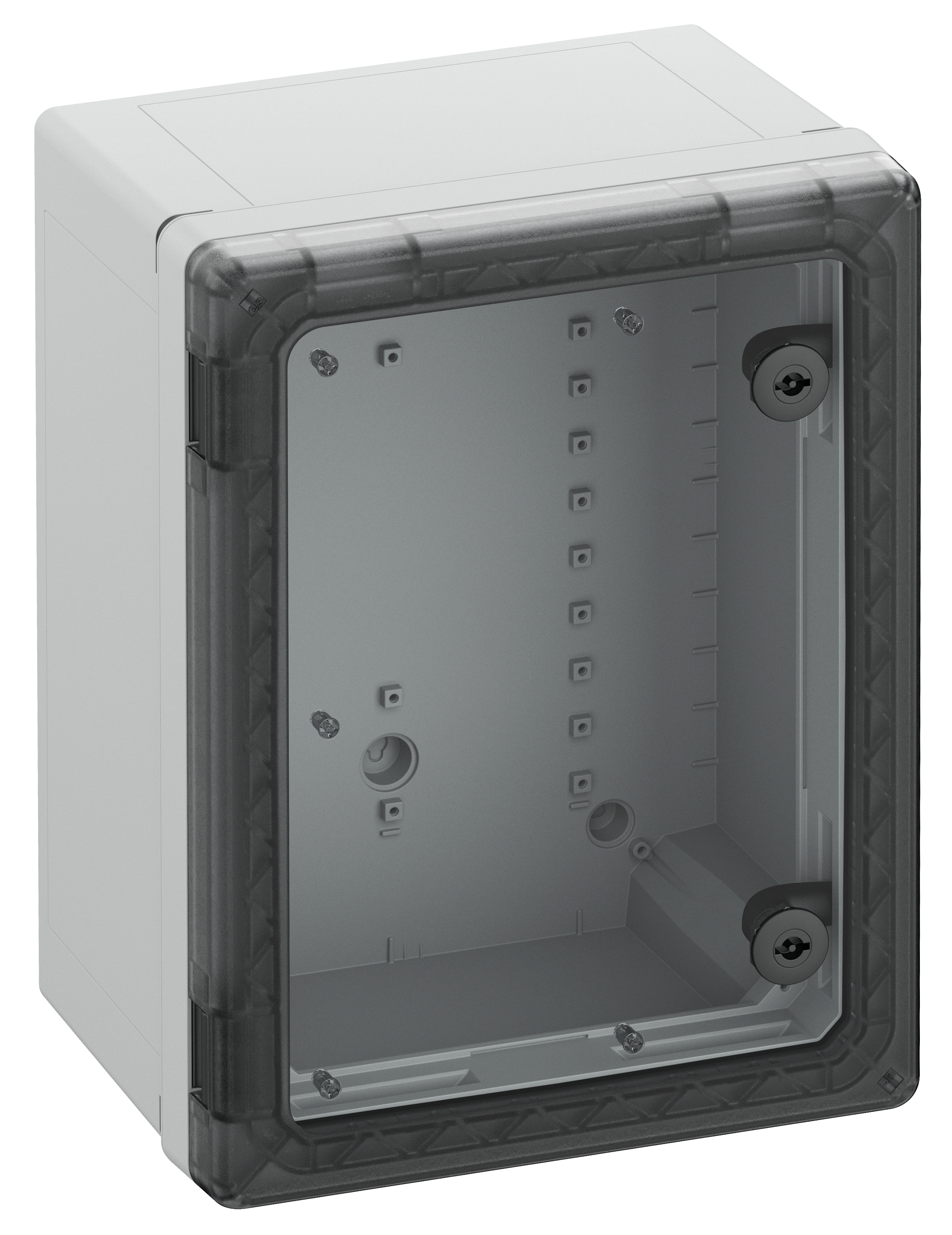 Skříňový rozvaděč, vhodný pro instalaci v zátěžovém prostředí a v nechráněném venkovním prostředí, krabice a rám: polykarbonát vyztužený skleněnými vlákny, šedý, podobný RAL 7035, dvířka: Polykarbonát.rozvaděčové zamykání 3 mm2dvojzub (možnost výměny) podle DIN 43668, s transparentními dvířkyRozměry: 300 x 400 x 226 mm