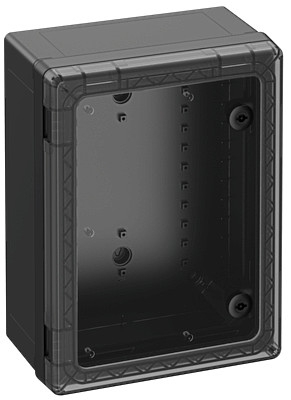 Skříňový rozvaděč, vhodný pro instalaci v zátěžovém prostředí a v nechráněném venkovním prostředí, krabice a rám: polykarbonát vyztužený skleněnými vlákny, černá, podobný RAL 9005, dvířka: Polykarbonát.rozvaděčové zamykání 3 mm2dvojzub (možnost výměny) podle DIN 43668, s transparentními dvířkyRozměry: 300 x 400 x 180 mm