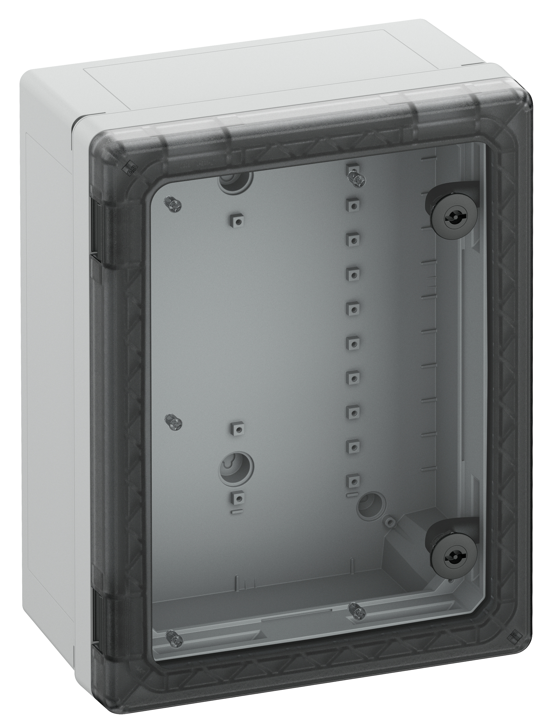 Skříňový rozvaděč, vhodný pro instalaci v zátěžovém prostředí a v nechráněném venkovním prostředí, krabice a rám: polykarbonát vyztužený skleněnými vlákny, šedý, podobný RAL 7035, dvířka: Polykarbonát.rozvaděčové zamykání 3 mm2dvojzub (možnost výměny) podle DIN 43668, s transparentními dvířkyRozměry: 300 x 400 x 180 mm