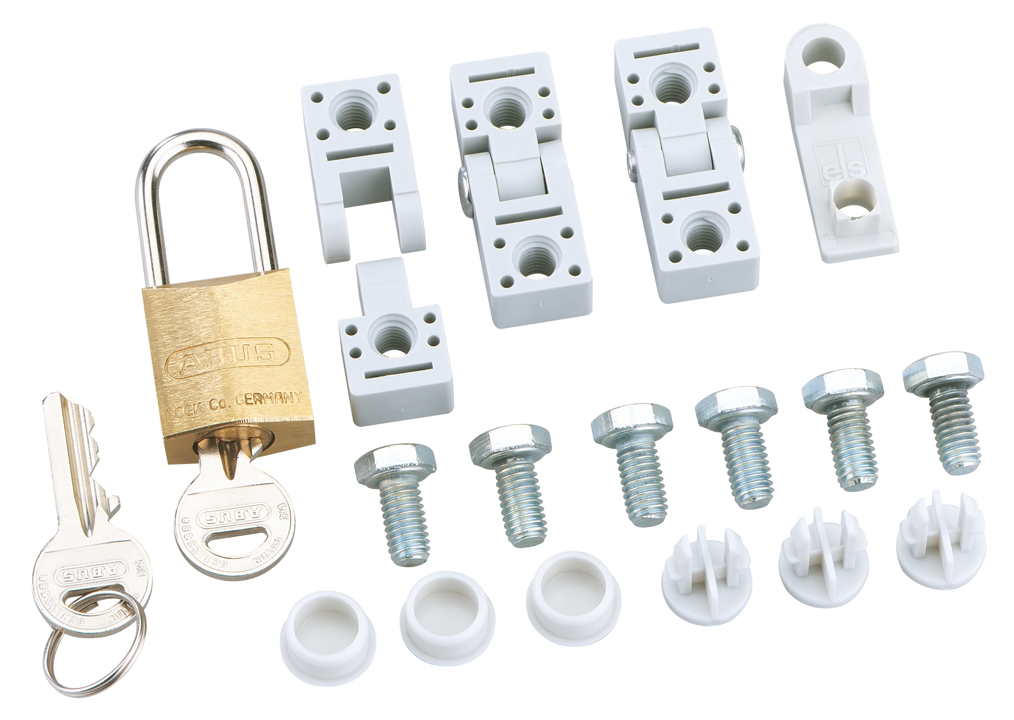 Sada visacího zámku pro přestavbu víka skříně na zamykatelné vyklápěcí dveře, včetně visacího zámku, 2 závěsů, upevňovacích šroubů, záslepek a vrtací šablony, od TK PS/PC 1811 a AKL/AKi 1Rozměry: 100 x 80 x 25 mm